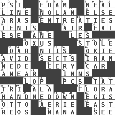 ACROSS 1. Air pressure measure (abbr.) 4. Dutch treat 8. Be tempered by heat 12. Actor's bit 14. Pitcher Ryan 16. Otherwise 17. Ancient river in northeast Turkey 18. Pleas 20. Portable shelters 22. Wind 23. Erode 24. Compass dir. 25. One (Scot) 28. French article 30. Amu Darya 31. Took without asking 35. Rowing implement 37. Nuclear Threat Initiatives 40. Migrant worker of the '30s 41. Enthusiastic 42. Religious groups 44. SW Asia republic 45. Ancient Persian 46. Suggestive of the supernatural 47. 4-wheeled motor vehicle 48. Approach 50. Taverns 52. Trim (branches) 54. Personal Computers (abbr.) 55. Make lace 58. Three (prefix) 61. According to 63. Plants 65. Sleeping bag shop? 70. The front part of a cuirass 71. "Beetle Bailey" pooch 72. Nest on high 73. 90 degrees 74. Vintage cars 75. Nanny 76. Perceive with the eye DOWN 1. Food holder 2. Male parents of animals 3. Lacking in sense or substance 4. Compass dir. 5. Spanish title 6. The first octave above the treble staff 7. Hindu Mythology: god of death 8. Fish or hair follower 9. Writer Wiesel 10. Toward the sea 11. For fear that 13. Eastern Standard Time (abbr.) 15. Famous astronaut Armstrong 19. Ancient Greek god of war 21. Saxophone 26. Religious women 27. First name in cosmetics 29. Unemotional ones 30. Severe or trying experience 32. Gumbo ingredient 33. One who doesn't tell the truth 34. Car or cant ending 35. Baking chamber 36. Assistant 38. Frozen water 39. Remove all contents or possession from 41. Nanny (var.) 43. Synchronize (abbr.) 49. Wander 51. Science/research agcy. 53. Entreaty 55. Ancient Roman robes 56. Originate 57. Clothes sense 58. Son of Odin 59. Pace 60. To the inside or interior of 62. An important port of Yemen 64. Area sheltered from the wind 66. Two (Sp.) 67. Mouth or opening 68. Victory 69. Teachers' org.