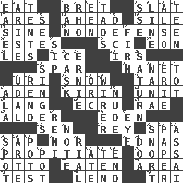 ACROSS 1. Consume 4. Cy Young winner Saberhagen 8. Narrow board 12. Ancient Greek god of war 14. Having the leading position 16. Drop; flow; fall 17. Trig term 18. Unrelated to defense, as in spending 20. _____ Park, CO 22. _-fi 23. Period of immesurable duration 24. French article 25. Frozen water 28. Big collection agency 30. Coast Guard woman 31. French painter Edouard 35. RI univ. 37. Overwhelm 40. Edible starchy tuberous root 41. An important port of Yemen 42. Japanese brewing company 44. A single undivided whole 45. Long (Scottish) 46. Shade of tan 47. Actress Charlotte 48. Tree or shrub in the Birch family 50. Genesis locale 52. Elected rep. 54. Marina Del _, California 55. Health resort 58. Plant excrement 61. And not 63. Ferber et al. 65. Appease 70. I made a mistake 71. Von Bismarck 72. Ingested 73. Type of rug 74. Trial 75. Grant temporary use of 76. Three (prefix) DOWN 1. Artist's stand 2. Ascend 3. Portable shelters 4. Prohibit 5. 17th letter of the Greek alphabet 6. Car or cant ending 7. Small boys 8. Compass dir. 9. Actor's bit 10. In addition 11. Adolescent 13. Observe 15. Tenth: prefix 19. Not soft or yielding to pressure 21. Small drink 26. Keg 27. Bert's buddy 29. Titan orbits this 30. Scorches 32. Nanny 33. One of the Great Lakes 34. Small child 35. Freehold land 36. Tear apart 38. The grampus (Milton) 39. One who wires 41. Wing 43. Unadorned 49. Painter Guido (1575-1642) 51. Sight organ 53. Observe 55. Derisive sound 56. Some stationery 57. Slender Brazilian palm 58. Specific locale 59. Johnson of "Laugh-In" 60. Cooking vessels 62. Monetary unit of Yemen 64. ___ good deed 66. Plant holder 67. Had dinner 68. "___ Little Indians" 69. Conclusion