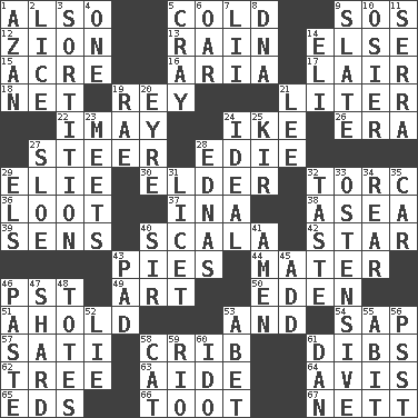 ACROSS 1. In addition 5. Having a low temperature 9. Distress signal 12. The Jewish people; Israel 13. Precipitation 14. Otherwise 15. Measure of real estate 16. Roberta Peters solo 17. Den 18. Fish or hair follower 19. Marina Del _, California 21. 61 cubic inches 22. "If ____ say so..." 24. Mamie's husband 26. Epoch 27. Bull 28. Singer Brickell 29. Writer Wiesel 30. A person who is older than you are 32. Torque (variant) 36. Plunder 37. _ tizzy (2 wds.) 38. Toward the sea 39. Elected reps. 40. Any of the three canals of the cochlea 42. Play the lead 43. Sliced desserts 44. Mother 46. Pacific Standard Time (abbr.) 49. Nonscientific branch of learning 50. Locale of original sin 51. Hold, grip (Informal) 53. Added to 54. Plant excrement 57. Suttee (variant) 58. Baby bed with high sides 61. Claim 62. Woody plant 63. Assistant 64. Opinion 65. Begley and Asner 66. A blast of a horn 67. Remaining after all deductions DOWN 1. Muslim summons to prayer 2. Louse (plural) 3. Decision 4. Single 5. Supercomputer manufacturer 6. Boat paddle 7. Cards in a Roman deck? 8. Heredity factor (abbr.) 9. Chalkboard 10. Flexible twig of a willow tree 11. Spanish missionary in California 14. Connecticut Ivy Leaguer 19. Actress Charlotte 20. Jane of fiction 21. Area sheltered from the wind 23. Confronts 24. Standard of perfection 25. Apertif with cassis 27. A type of plum 28. Ferber et al. 29. Raised railways 31. It is permitted: Lat. 32. Clothes sense 33. Clearly or manifestly demonstrative 34. Tail end 35. Auto 40. Title for a knight 41. So be it 43. Groovy apt. 45. Find the sum of 46. Thick mixture 47. Broken piece 48. Hauls 52. Whopper 53. Collude with 55. "This won't hurt ____!" 56. Inconspicuous attention getter 58. Domesticated feline 59. _ de Janeiro 60. Wedding promise 61. Daniel's nick name