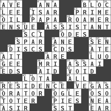 ACROSS 1. "___ Maria" 4. Santa ___, CA 7. Coalition 11. Area sheltered from the wind 12. Austrian river, tributary to the Danube 13. First class 14. Petroleum 15. Dad 16. Nomad 17. Follow as a consequence or result 19. Helper 21. _-fi 23. Lyric poems 24. Coast Guard woman 25. One (Scot) 26. Elected rep. 29. Plates 30. Music discs 31. Had dinner 32. Small island 33. "We ___ not amused" (Victoria) 34. Nilotic language 35. Turn to the right 36. Medical imaging device (abbr.) 37. Slender Brazilian palm 40. Begley and Asner 41. Help 42. State of nonexistence 43. Globular water bottle used in Asia 45. Everything 46. Home 51. Viva Las _ 55. Speaker 56. Stare 58. Bear (Spanish) 59. Carrier 60. Sliced desserts 61. Teachers' org. 62. SW Saudi Arabia district 63. Fast jet (abbr.) 64. Ewer handle DOWN 1. Medicinal plant 2. Distinctive style or manner 3. Snakelike fish 4. White ___ sheet 5. California wine valley 6. Caspian sea tributary 7. Naughty children 8. Pale green bean 9. Presage 10. Foregone conclusion 12. Medicinal drug used to evoke vomiting 13. Introduce or present, as a question 16. Amusement-park features 18. United States Postal Service (abbr.) 20. Something which is sent 22. Big collection agency 24. Settings 25. Bitter 26. Vegetable dish 27. Needle holder 28. Modern: prefix 29. Passed on 32. Ripen 33. Believer in; advocate of (suffix) 36. Mother 37. Actress Gardner 38. Finds the solution 39. Drop; flow; fall 43. 61 cubic inches 44. Aroma 46. Round or rotation of duties 47. Greek god of love 48. Suttee (variant) 49. 911 reaches them 50. The front part of a cuirass 52. Went 53. At sea 54. Fly high 57. Allow
