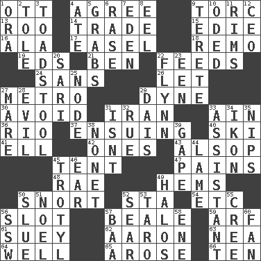 ACROSS 1. Baseball player Mel 4. Match 9. Torque (variant) 13. Friend of Pooh 14. Buy and sell 15. Singer Brickell 16. In the manner of 17. Artist's stand 18. San ____ (Riviera town) 19. Begley and Asner 21. Benjamin's nick name 22. Eats 24. Without 26. Allow 27. Paris' subway 29. Unit of force 30. Prevent from happening 31. SW Asia republic 33. The 18th letter of the Arabic alphabet 36. River (Sp.) 37. Taking place subsequently 40. What Jean-Claude Killy likes to do 41. Pipe bend 42. Washington bills 43. Columnist Joseph or Stewart 45. Portable shelter 47. Aches 48. Actress Charlotte 49. Equivocates 50. Derisive sound 52. R.R. building 54. And so on (abbr.) 56. Position in a hierarchy or organization 57. Memphis, Tenn. Street 59. Sandy's bark 61. Chop _ 62. Composer Copland 63. Teachers' org. 64. Not ill 65. Came up 66. "___ Little Indians" DOWN 1. Mouth or opening 2. Lacquered or enameled metalware 3. Inedible or poisonous agaric 4. Had dinner 5. Takes hold of 6. To erase 7. Locale of original sin 8. Snakelike fish 9. Cylindrical with tapered ends 10. Wrote a lyric poem 11. Basketball hoops 12. Corporate head (abbr.) 20. Indian skirt 22. Film actor Errol 23. Car or cant ending 25. Connecting point 27. Female horse 28. Morally bad or wrong 29. Raised platform 31. Is not 32. Sorrow 33. Helper 34. Image 35. Pinches, bites 38. Music written for nine 39. Yawn 44. Unable to walk 45. Trinitrotoluene 46. Ewer handle 49. Saint headwear 50. Change direction abruptly 51. Christmas carol 52. Wither 53. Pacific island yam 55. Algonquian 56. Compass dir. 57. Sound made by sheep 58. Compass dir. 60. Air blower