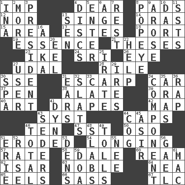 ACROSS 1. Mischievous child 4. Letter starter 8. Groovy apts. 12. Not either 13. Burn superficially 14. Mouths or openings 15. Length times width 17. _____ Park, CO 18. Sweet dark-red dessert wine 19. Core 21. College papers 23. Eisenhower's nickname 24. _ Lanka 26. Sight organ 27. Freehold land 28. Cause heat under the collar 30. Compass dir. 31. Fortification 34. Automobile 37. Animal enclosure 38. Having winglike extensions 39. Mouth or opening 40. Tate display 41. Window treatments 42. Atlas unit 43. System (abbr.) 44. Balmoral and tarboosh 46. Nine, plus one 47. Fast jet (abbr.) 50. Bear (Spanish) 51. Worn away 54. Yearning 57. Pace 58. Peak District village in England 60. 480, 500 or 516 sheets of paper 62. Austrian river, tributary to the Danube 63. Impressive in appearance 64. Teachers' org. 65. Snakelike fish 66. Backtalk 67. Affectionate concern, for short DOWN 1. _ tizzy (2 wds.) 2. Greater amount 3. Elected leader of a country 4. Flat circles 5. Keyboard key 6. Grow older 7. Repose 8. Wimpy's pal 9. Came up 10. Have the gumption 11. Fast planes 13. Elected rep. 16. "____ silly question..." 20. Snakelike fish 22. Aid 25. Feeling or showing extreme anger 27. One who uses or employs something 29. Angers 30. Health resort 31. Hearing organs 32. Narrow boards 33. Head covering 34. Piece 35. Caspian sea tributary 36. Reproach for some lapse or misdeed 41. Unit of force 43. Spring feasts 44. Gear tooth 45. SW Saudi Arabia district 46. "_____ Recall" 48. Thick slices 49. For Whom the Bell _____ 51. One of the Great Lakes 52. Raze (variant) 53. Habitations of wild animals 55. Born 56. Highlander 59. ___ good deed 61. Apple computer (short form)