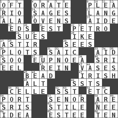 ACROSS 1. Often (poetically) 4. Speak pompously 9. Entreaty 13. River (Sp.) 14. Gurus 15. Austrian-born American filmmaker Fritz 16. Chicken ___ king 17. Baking chambers 18. Helper 19. Begley and Asner 21. Eastern Standard Time (abbr.) 22. Stone: prefix 24. Institutes legal proceedings 26. D.D.E's nickname 27. Having gotten out of bed 29. Perceives with the eye 30. Graphs 31. Ketch in the Levant 33. Assist 36. "Barney Miller" actor Jack 37. Normal relaxed breathing 40. Indian title of respect (Mr.) 41. Snakelike fish 42. It's straight from the horse's mouth 43. Flower holders 45. Necklace unit 47. From or relating to Ireland 48. Keyboard modifier key 49. Fast planes 50. Cell (Danish) 52. Fast jet (abbr.) 54. And so on (abbr.) 56. Sweet dark-red dessert wine 57. Sir (Sp.) 59. "We ___ not amused" (Victoria) 61. Indian titles of respect 62. Vertical member of a panel or frame 63. Born 64. The main thing one is thinking about 65. First name in cosmetics 66. "___ Little Indians" DOWN 1. Mouth or opening 2. Do some clerical work 3. Inedible or poisonous agaric 4. Bear (Spanish) 5. All-night dance parties 6. Grows older 7. Portable shelter 8. Curvy letter 9. Food holders 10. Den 11. Inside; within (prefix) 12. Ripen 20. Costume for a special activity 22. Component 23. Make supply last 25. Celtic language 27. Domed church section 28. A type of plum 29. The Jewish people; Israel 31. Hurried 32. Cuckoo 33. Aide 34. Angers 35. Food container 38. A salt of uric acid 39. Advice 44. Johnson of "Laugh-In" 45. Greek mezzo-soprano Agnes 46. Pipe bend 49. Took without asking 50. Drawstring 51. 4th largest of the Great Lakes 52. Arranges properly for use 53. In a ____ (agitated or irritated) 55. Algonquian 56. Air pressure measure (abbr.) 57. Compass dir. 58. To sift 60. Car or cant ending
