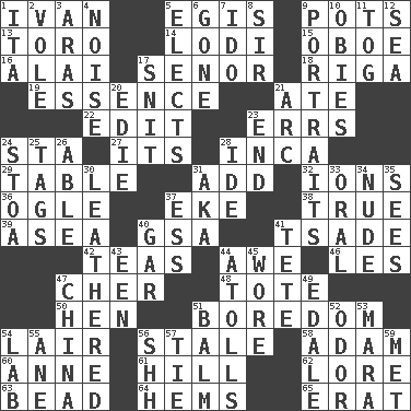 ACROSS 1. "Terrible" tsar 5. Armor plate that protects the chest 9. Cooking vessels 13. "Corrida" creature 14. Farming town in central California 15. Mitch Miller's instrument 16. Jai ____ 17. Sir (Sp.) 18. Port city in Latvia 19. Substance 21. Had dinner 22. Prepare for publication 23. Blunders 24. R.R. building 27. It is 28. South American Indian 29. Eating place 31. Increase 32. Charged atoms 36. Stare 37. Make supply last 38. Loyal 39. Toward the sea 40. Girls' org. (abbr.) 41. Sadhe (variant) 42. Beverages made from leaves 44. Deep reverence 46. French article 47. "Mermaids" star 48. Lug 50. Layer 51. Mood resulting from idleness 54. Den 56. Having lost freshness 58. First of billions? 60. Singer Murray 61. Land elevation 62. Old wives' tales, e.g. 63. Necklace unit 64. Folds over and sews together 65. Part of Q.E.F. DOWN 1. Call ___ day 2. Short-tailed, large-bodied rat 3. Caspian sea tributary 4. Annoying sound 5. Chooses 6. Went 7. Wedding promise 8. Title for a knight 9. Likenesses of persons 10. Off-Broadway awards 11. Coat; cloak 12. Ocean 17. In a ____ (agitated or irritated) 20. Singer Brickell 21. Curve 23. Conclusion 24. Portico 25. Labels 26. Competent 28. Binary compound 30. Resembling or made to resemble leather 31. Alias (abbr.) 33. Relating to the mouth 34. Unadorned 35. Perceives with the eye 37. Double-curved letter 40. Slender fish 41. False hair 43. Car or cant ending 44. Ringlike coral islands and reefs 45. Had on 47. Large country 49. Peak District village in England 51. Lip ointment 52. Scent 53. Hindu Mythology: god of death 54. Experiment locale 55. One (Scot) 56. Quiet! 57. Make a knot 59. Was introduced to