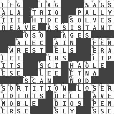 ACROSS 1. Part of a journey 4. Label 7. Droops 11. Wing 12. Musical group of three 13. Chummy 14. One more than two 15. Flintstone garb 16. Finds the solution 17. Rob, plunder, or pillage 19. Aide 21. Bear (Spanish) 23. Grows older 24. Actor Baldwin 25. The 18th letter of the Arabic alphabet 26. Opposite of masc. 29. Obtain by seizing forcibly or violently 30. Raised railways 31. Epoch 32. Luau accessory 33. Big collection agency 34. Mouth edge 35. It is 36. _-fi 37. White Person, in Hawaii 40. Compass dir. 41. Area sheltered from the wind 42. Inactive volcano in Sicily 43. Glance over 45. Allow head to fall sleepily 46. Determination 51. Failure 55. Foolish or stupid persons 56. Small valley 58. "___ Maria" 59. Having high moral qualities 60. "Vaya con ____" 61. Writing instrument 62. Celtic language 63. Secret 64. Compass dir. DOWN 1. Den 2. Writer Wiesel 3. Greek goddess of the earth (variant) 4. Three (prefix) 5. Opera by Verdi 6. Moves 7. Table seasonings 8. Inventor's middle name 9. Small, secluded valley 10. System (abbr.) 12. College papers 13. Introduce or present, as a question 16. Signals 18. Grand slam 20. Moves on water 22. Sep. follower 24. Get up 25. Nest on high 26. Chap (slang) 27. One of the Great Lakes 28. Atlas unit 29. Moistens 32. Falsehood 33. Ancient Celtic tribe of eastern Britain 36. Narrow boards 37. Layer 38. Ringlike coral islands and reefs 39. Southwest Nigerian state 43. Fur scarf 44. Quote 46. Trig term 47. Aroma 48. Teases 49. Probability 50. Famous astronaut Armstrong 52. Plant excrements 53. Nights before holidays 54. French philosopher Descartes 57. Myrna of the movies