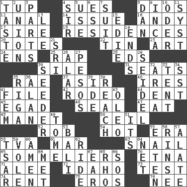 ACROSS 1. Uncastrated adult male sheep 4. Institutes legal proceedings 8. "Vaya con ____" 12. Of or related to the anus 14. Come out of 16. Actor Griffith 17. The founder of a family 18. Homes 20. Lugs 22. Shallow baking pan 23. Nonscientific branch of learning 24. Followers of ems 25. Hit sharply and swiftly 28. Begley and Asner 30. Filth; sediment 31. Theater features 35. Actress Charlotte 37. SW Saudi Arabia district 40. Angers 41. Do some clerical work 42. Cowboy competition 44. Incision 45. Mild oath 46. Lick closed 47. Consume 48. French painter Edouard 50. To provide with a ceiling 52. Director Reiner 54. Being at a high temperature 55. Epoch 58. Federal power corp. 61. Impair 63. Slow-paced one 65. Wine waiters 70. Inactive volcano in Sicily 71. Toward shelter 72. Potato state 73. Trial 74. Monthly bill 75. Greek god of love 76. Born DOWN 1. Clothes sense 2. The state of being joined or united 3. Components 4. Title for a knight 5. Purpose 6. Curvy letter 7. Costume for a special activity 8. One of the 12 tribes of Israel 9. South American Indian 10. Baltic tributary 11. System (abbr.) 13. Area sheltered from the wind 15. Singer Brickell 19. Extremities 21. Indian title of respect (Mr.) 26. Having or resembling wings 27. Mexican monetary units 29. A glass for beer 30. Sowing specialist 32. Type of rug 33. Portable shelter 34. Fast jet (abbr.) 35. Capital of Latvia 36. ____ Jay Lerner 38. Binary compound 39. Arrive at 41. Opposite of masc. 43. Margarine 49. Heavy book 51. ___ a Wonderful Life 53. Indonesian resort city 55. Consumed 56. Remove soap 57. Having winglike extensions 58. Russian ruler of old 59. Grand slam 60. So be it 62. Travel on an animal 64. Fish or hair follower 66. Was introduced to 67. Hearing organ 68. 17th letter of the Greek alphabet 69. Mayday