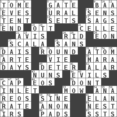 ACROSS 1. Heavy book 5. Yard entry 9. Sound made by sheep 12. Nights before holidays 13. Mountain range 14. Elected reps. 15. Portable shelter 16. Puts into a specified state 17. Settles 18. Conclude 19. Baseball player Mel 21. Cell (Danish) 22. Opinion 24. To free from 26. Period of immesurable duration 27. Any of the three canals of the cochlea 28. Without 29. Raised platform 30. Single shot of ammunition 32. Smallest unit of an element 36. Johnson of "Laugh-In" 37. Compete 38. Hindu Mythology: god of death 39. 24-hour periods 40. Prevent from occurring 42. Having or resembling wings 43. Religious women 44. Vices 46. Head covering 49. Greek goddess of the dawn 50. Do not 51. An arm off of a larger body of water 53. Cut the grass 54. Santa ___, CA 57. Vintage cars 58. Trig term 61. Flair 62. Assign a rank or rating to 63. At once, immediately (arch.) 64. Egg locale 65. Big collection agency 66. Writing tablets 67. Fast planes DOWN 1. Wig 2. Baking chamber 3. Ananias' fault 4. Eastern Standard Time (abbr.) 5. Abrupt rush of wind 6. "We ___ not amused" (Victoria) 7. Make lace 8. Raised railways 9. Calif. Air Force Base 10. White American of non-Hispanic descent 11. NE Netherlands city 14. Compass dir. 19. Lubricate 20. Russian ruler of old 21. Music discs 23. Flower holders 24. The wife of a rajah (variant) 25. Indiana (abbr.) 27. "Two Mules for Sister ____" 28. Sets of matching outer garments 29. Male parent 31. Baking chambers 32. With great haste 33. Baron Munchausen's specialties 34. Mouths or openings 35. Make imperfect 40. Superhero pair 41. Redecorate 43. Fish or hair follower 45. Promise 46. High-altitude cloud 47. Approach 48. Small pieces of grounds 52. Compass dir. 53. Not women's 55. Political cartoonist Thomas 56. Pismires 58. Plant excrement 59. _ tizzy (2 wds.) 60. Allow head to fall sleepily 61. Followers of ems