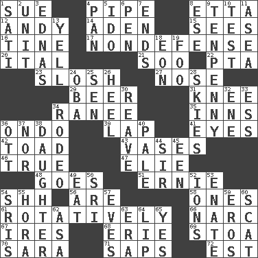 ACROSS 1. Institute legal proceedings 4. Corncob 8. Singer James 12. Actor Griffith 14. Arabian gulf 15. Observes 16. Prong on a fork 17. Unrelated to defense, as in spending 20. Slanted text style (abbr.) 21. "Barney Miller" actor Jack 22. Parent Teacher Assoc. 23. Splash clumsily 27. Sense of smell 29. Fermented drink made from hops 31. Leg joint 34. Indian princess (variant) 35. Lodging establishments 36. Southwest Nigerian state 39. Pet locale 41. Sight organs 42. Frog relative 43. Flower holders 46. Loyal 47. Writer Wiesel 48. Moves 51. Bert's buddy 54. Quiet! 56. "We ___ not amused" (Victoria) 58. Washington bills 61. Happening in regular succession 66. Drug cop 67. Angers 68. 4th largest of the Great Lakes 69. Portico 70. "Two Mules for Sister ____" 71. Plant excrements 72. Eastern Standard Time (abbr.) DOWN 1. Suttee (variant) 2. A single undivided whole 3. Ferber et al. 4. Baking dish 5. Wedding promise 6. Animal enclosure 7. Extremities 8. Compass dir. 9. 3-inch nail 10. Trial 11. Toward the sea 13. Shout 18. A really long time 19. Egg _ yung 24. Chief or king in Benin or Nigeria 25. Elected rep. 26. Person who is morally reprehensible 28. Atmospheres 30. Break or tear apart 32. Compass dir. 33. Curvy letter 34. Cowboy competition 36. Baseball player Mel 37. Or not 38. Female offspring 40. Diluted with white 44. Title for a knight 45. Car or cant ending 49. Ingest 50. Indian title of respect (Mr.) 52. Charged particles 53. Related on the mother's side 54. Indian titles of respect 55. Israeli folk dance 57. Nights before holidays 59. Greek god of love 60. Jazz singing style 62. White ___ sheet 63. Epoch 64. Mouth edge 65. Consenting reply