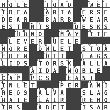 ACROSS 1. Hollow 5. Frog relative 9. Soggy 12. The content of cognition 13. Operatic vocal solo 14. Celtic language 15. Letter starter 16. Sharp remark 17. Erode 18. Eastern Standard Time (abbr.) 19. Mountains (abbr.) 21. Writing tables 22. Same (prefix) 24. Fifth month 26. Neckwear 27. Crowbar 28. Ubangi River tributary 29. Greater amount 30. A small or young owl 32. Portico 36. Genesis locale 37. Baseball player Mel 38. Falls behind 39. Hats (slang) 40. Cod relative 42. Silent film actress Nazimova 43. Opera by Verdi 44. Impressive in appearance 46. Head covering 49. Personal Computers (abbr.) 50. 90 degrees 51. An arm off of a larger body of water 53. For each 54. Cuckoo 57. Vintage cars 58. Inventor's middle name 61. Volcanic refuse 62. Pace 63. Den 64. Former U.S. Attorney General Janet 65. Big collection agency 66. Collude with 67. Austrian river, tributary to the Danube DOWN 1. Flintstone garb 2. Lyric poems 3. Tough but pliablecoriaceous 4. Hearing organ 5. Bar bills 6. Mouth or opening 7. Atmosphere 8. Pat or tap gently 9. Obtain by seizing forcibly or violently 10. 1973 Nobel Price Winner (Physics) Leo 11. Laconic 14. She-sheep 19. Madame (abbr.) 20. "Corrida" creature 21. Color 23. Baking chambers 24. Confronts 25. Keyboard modifier key 27. Farming town in central California 28. Extreme 29. Cartoonist voice _ Blanc 31. Forest 32. Thick slices 33. Baron Munchausen's specialties 34. Stare at amorously 35. White ___ sheet 40. Nervous spasm 41. Leg joint 43. Fitting 45. Boat paddle 46. High-altitude cloud 47. Approach 48. Secret plans 52. Compass dir. 53. Piece 55. Nanny 56. Russian composer Stravinsky 58. According to 59. Experiment locale 60. Compete 61. _ Lanka