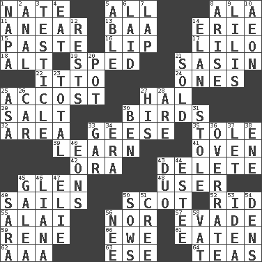 ACROSS 1. Nathan's nickname 5. 100% 8. According to 11. Approach 13. Sound made by sheep 14. 4th largest of the Great Lakes 15. Thick mixture 16. Mouth edge 17. _ and Stitch 18. Keyboard modifier key 19. Drove too fast 21. Indian antelope 22. "Tell ____ the Marines!" 24. Washington bills 25. Buttonhole 27. Actor Linden 29. Table seasoning 30. Avian creatures 32. Length times width 33. Honkers 35. Lacquered or enameled metalware 39. Acquire or gain knowledge or skills 41. Baking chamber 42. Mouth or opening 43. Keyboard key 45. Small, secluded valley 48. One who makes use of a thing 49. Travel by water 50. Native of Scotland 52. To free from 55. Jai ____ 56. Or not 57. Dodge 59. French philosopher Descartes 60. She-sheep 61. Consumed 62. American Automobile Association (abbr.) 63. Compass dir. 64. Afternoon social gatherings DOWN 1. California wine valley 2. Of or related to the anus 3. A testis 4. Consume 5. Competent 6. Put down 7. Pet locale 8. Originate 9. Ms. Damita and namesakes 10. Age 12. Musical pauses 14. Style 20. Plant holder 21. Exchanged or delivered for money 23. "_____ Recall" 25. White ___ sheet 26. 4-wheeled motor vehicle 27. Part of HMS, perhaps 28. "We ___ not amused" (Victoria) 30. Benjamin's nick name 31. Took without asking 33. Slender fish 34. Epoch 36. Make much ado about nothing 37. Allow 38. Compass dir. 40. Immeasurably long periods of time 43. Superhero pair 44. First name in cosmetics 45. An organ shaped like a helmet 46. Climbing, woody, usually tropical vines 47. Writer Wiesel 49. "Two Mules for Sister ____" 50. Sty mamas 51. Algonquian 53. It may be bright or harebrained 54. Lairs 56. Born 58. Large container