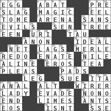 ACROSS 1. Ovum 4. Blind as ____ 8. Before (prefix) 11. Volcanic refuse 13. Mysterious quality of enchantment 15. Snakelike fish 16. Heavy book 17. Sports stadium 18. Without 19. Vices 21. Elected rep. 22. Family _ (genealogy) 23. Car or cant ending 24. RI univ. 27. The 19th letter of the Greek alphabet 29. At once, immediately (arch.) 30. Standard of perfection 34. Fish or hair follower 36. Fails to keep up a pace 39. Haggard of country music 40. Do over again 41. Related on the mother's side 43. The longest river in the world 44. Place in a line 46. Greek god of love 47. Beverage made from leaves 48. Entreaties 49. Writing tablets 51. Part of a journey 53. Take to court 54. Call ___ day 57. Of or related to the anus 60. Keyboard modifier key 63. One who wires 65. Kenny Rogers chart-topper in '80 66. Elude 69. Words to Nanette 70. Conclusion 71. Citrus fruits 72. Pismires 73. Greek goddess of the dawn 74. Is not 75. Compass dir. DOWN 1. First name in cosmetics 2. Michael Jackson trademark 3. Street urchin 4. Wet nurse (var.) 5. Soap unit 6. Eons 7. Prong on a fork 8. Lightbulb-shaped fruit 9. French philosopher Descartes 10. Otherwise 12. Set 14. Patter 18. SAT takers 20. Player for Phoenix 25. Hero or heavy, e.g. 26. Lacking in sense or substance 28. Direct toward a target or goal 29. Lacking a tonal center or key 31. 4th largest of the Great Lakes 32. Silent film actress Nazimova 33. Area sheltered from the wind 34. 1994 drama film starring Jodie Foster 35. Singer Brickell 37. Slender fish 38. Closes up, plugs up 40. Hit sharply and swiftly 42. He sold his birthright 45. Compass dir. 50. Morning condensation 52. Highlander 54. Metal shackles 55. Portable shelters 56. Came up 57. Toward shelter 58. Billionth: prefix 59. Does sums 61. 57 in ancient Rome 62. Scottish caps 64. _ tizzy (2 wds.) 67. Lair 68. Eastern Standard Time (abbr.)