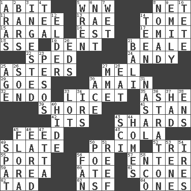 ACROSS 1. "This won't hurt ____!" 5. Compass dir. 8. Fish or hair follower 11. The wife of a rajah (variant) 13. Actress Charlotte 14. Heavy book 15. Therefore, facetiously 16. Eastern Standard Time (abbr.) 17. Give off 18. Compass dir. 19. Incision 21. Calif. Air Force Base 22. Drove too fast 24. Actor Griffith 25. Michaelmas daisies 27. Cartoonist voice _ Blanc 29. Moves 30. At full speed 32. Inside; within (prefix) 33. It is permitted: Lat. 35. American tennis player Robert 39. Dinah or Pauly 41. Comedian Laurel of Laurel & Hardy 42. It is 43. Broken pieces 45. Nourish 48. Root beer relative 49. Schedule 50. Demure 52. Three (prefix) 55. Sweet dark-red dessert wine 56. Enemy 57. Keyboard key 59. Type of rug 60. Had dinner 61. Biscuitlike quick bread 62. Small boy 63. Overdraft (abbr.) 64. Washington bills DOWN 1. Caspian sea tributary 2. Taverns 3. Swallowed 4. Afternoon social gathering 5. Songbird 6. Political cartoonist Thomas 7. Dripping 8. Wanderer 9. Poet Dickinson 10. False hair 12. A person who is older than you are 14. Adolescent 20. Begley and Asner 21. Indonesian resort city 23. Mexican monetary units 25. Personal question 26. Boy, to dad 27. Madame (abbr.) 28. Consume 30. Adept person 31. Relating to the nose 33. Car dealer's back yard 34. Big collection agency 36. Ski resort town in Vermont 37. Possessed 38. Followers of ems 40. Flintstone garb 43. _-fi 44. Dwellings 45. Plants 46. Having ears or earlike features 47. Singer James 49. Argument over a trivial matter 50. Plant holders 51. Coral ridge 53. French philosopher Descartes 54. Angers 56. Avid follower 58. Non-commissioned officer (abbr.)