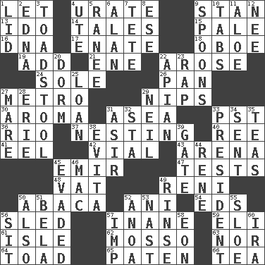 ACROSS 1. Allow 4. A salt of uric acid 9. Comedian Laurel of Laurel & Hardy 13. Wedding promise 14. Stories 15. Diluted with white 16. Heredity factor (abbr.) 17. Maternal 18. Mitch Miller's instrument 19. Say or write further 21. Compass dir. 22. Came up 24. Not divided or shared with others 26. Baking dish 27. Paris' subway 29. Cuts off 30. Odor 31. Toward the sea 33. Pacific Standard Time (abbr.) 36. River (Sp.) 37. Inhabiting a nest 40. Portuguese money of account (variant) 41. Snakelike fish 42. Small bottle 43. Sports stadium 45. Independent ruler or chieftain 47. Trials 48. Large container 49. Painter Guido (1575-1642) 50. Phillipine bananalike plant 52. Cuckoo 54. Begley and Asner 56. Downhill vehicle 57. Lacking in sense or substance 59. Biblical high priest 61. Capri or Wright 62. With motion or animation 63. Not either 64. Frog relative 65. Eucharist need 66. Afternoon social gathering DOWN 1. Hat (slang) 2. Pulitzer Prize-winning author Ferber 3. Inedible or poisonous agaric 4. Shoshoni 5. The wife of a rajah (variant) 6. ____ Jay Lerner 7. False hair 8. Compass dir. 9. Soup utensils 10. Bar bills 11. Medicinal plant 12. Born 20. Dormintory (informal) 22. Bee-related 23. Strike 25. Grant temporary use of 27. Female horse 28. 4th largest of the Great Lakes 29. Famous astronaut Armstrong 31. SW Saudi Arabia district 32. R.R. building 33. Elected leader of a country 34. Emitted 35. Beverages made from leaves 38. Webber/Rice musical 39. Yard entry 44. French philosopher Descartes 45. Dodged 46. Big _ 49. Wash lightly 50. In addition 51. Actor Lugosi 52. Small Philippine buffalo 53. Political cartoonist Thomas 55. A type of plum 56. Be seated 57. Mischievous child 58. Age 60. Retirement account (abbr.)