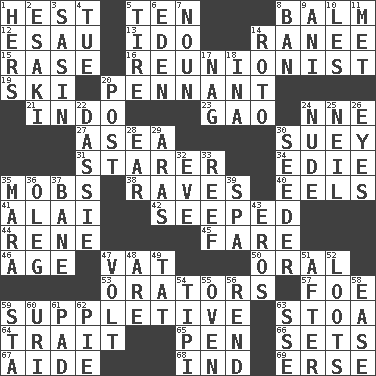 ACROSS 1. Behest 5. Nine, plus one 8. Lip ointment 12. Son of Isaac 13. Wedding promise 14. Indian princess (variant) 15. Raze (variant) 16. One who advocates reunion 19. What Jean-Claude Killy likes to do 20. Pre-World Series prize 21. _ china 23. E Mali city 24. Compass dir. 27. At sea 30. Chop _ 31. A viewer who gazes fixedly 34. Singer Brickell 35. Disorderly crowds 38. All-night dance parties 40. Snakelike fish 41. Mountain range southwest of Kyrgyzstan 42. Oozed 44. French philosopher Descartes 45. Conductor's collection 46. Mature 47. Large container 50. Taken by mouth 53. Speakers 57. Enemy 59. Supplementary 63. Portico 64. Distinguishing feature 65. Fenced enclosure 66. Puts into a specified state 67. Assistant 68. Working for oneself (abbr.) 69. Celtic language DOWN 1. Possessive pronoun 2. 1973 Nobel Price Winner (Physics) Leo 3. Indian antelope 4. Third day of the wk. 5. Hoop that covers a wheel 6. Locale of original sin 7. Part of speech 8. Bar 9. Cuckoo 10. French article 11. Was introduced to 14. Printing process, for short 17. Tired old horse 18. _ tizzy (2 wds.) 20. Mail 22. Hyrax 24. Naked 25. Famous astronaut Armstrong 26. Snake ____ (dice throw) 28. Hearing organ 29. Caspian sea tributary 30. Sowing specialist 32. Night before a holiday 33. Coral ridge 35. Hindu Mythology: god of death 36. Cassini of fashion 37. Object of repulsion 39. Health resort 43. Greek god of love 47. Electrical Unit 48. "We ___ not amused" (Victoria) 49. Make lace 51. Following 52. Plunders 54. Native american tent (variation) 55. Baking chamber 56. Tear apart 58. Relaxation 59. R.R. building 60. RI univ. 61. Groovy apt. 62. Sliced dessert 63. Compass dir.