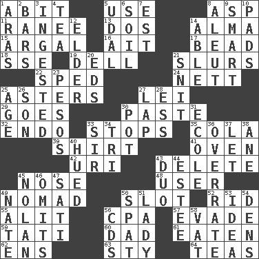 ACROSS 1. "This won't hurt ____!" 5. Purpose 8. Viper 11. Indian princess (variant) 13. Two (Sp.) 14. _ mater 15. Therefore, facetiously 16. Small island 17. Necklace unit 18. Compass dir. 19. Small valley 21. Disparaging remarks 22. Broke a traffic law 24. Remaining after all deductions 25. Michaelmas daisies 27. Luau accessory 29. Travels 30. Thick mixture 32. Inside; within (prefix) 33. Discontinues 35. Root beer relative 39. Chest covering 41. Baking chamber 42. RI univ. 43. Keyboard key 45. Characteristic smell of wine 48. One who makes use of a thing 49. Wanderer 50. Notch 52. To free from 55. Set down 56. Numbers guy (abbr.) 57. Elude 59. Jacques of French films 60. Male parent 61. Ingested 62. Followers of ems 63. Filthy place 64. Beverages made from leaves DOWN 1. Ancient river in northeast Turkey 2. Soap units 3. Consumed 4. Beverage made from leaves 5. Hereditary estate 6. Earth 7. Eastern Standard Time (abbr.) 8. Eskimo relative 9. Don Adams' spy role 10. Writing tablets 12. A person who is older than you are 14. Competent 20. Begley and Asner 21. In a ____ (agitated or irritated) 23. Mexican monetary units 25. Grow older 26. Boy, to dad 27. Pet locale 28. Double-curved letter 30. Plant holder 31. Learning spot: Fr. 33. Title for a knight 34. Three (prefix) 36. Make much ado about nothing 37. Allow 38. One (Scot) 40. Took on color 43. Superhero pair 44. First name in cosmetics 45. Pitcher Ryan 46. Leaves out 47. Suttee (variant) 49. Nathan's nickname 50. Petty quarrel 51. Kenny Rogers chart-topper in '80 53. The content of cognition 54. Cub Scout units 56. Music discs 58. Large container