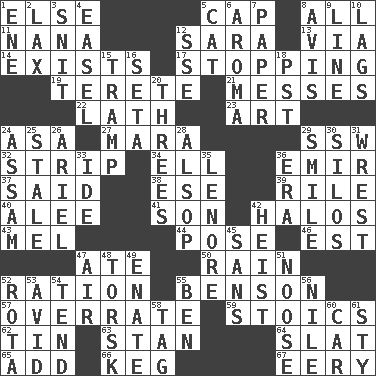 ACROSS 1. Otherwise 5. Head covering 8. Everything 11. Grandmother 12. "Two Mules for Sister ____" 13. By way of 14. Has an existence 17. Halting 19. Cigar-shaped 21. Makes clutter 22. Thin strip of wood or metal 23. Tate display 24. White ___ sheet 27. Hindu Mythology: god of death 29. Compass dir. 32. Long narrow piece of something 34. Pipe bend 36. Arab leader 37. Stated 38. Compass dir. 39. Cause heat under the collar 40. Toward shelter 41. Boy, to dad 42. Rings 43. Cartoonist voice _ Blanc 44. Airs 46. Eastern Standard Time (abbr.) 47. Had dinner 50. Precipitation 52. Food allowance for one day 55. Gillaume's butler role 57. Make much ado about nothing 59. Unemotional ones 62. Shallow baking pan 63. Comedian Laurel of Laurel & Hardy 64. Narrow board 65. Find the sum of 66. Barrel 67. Suggestive of the supernatural DOWN 1. Compass dir. 2. Not strict 3. In a ____ (agitated or irritated) 4. Artist's stand 5. Domesticated feline 6. Odor 7. Some stationery 8. Deliberation 9. Actor's bit 10. Fails to keep up a pace 12. Compass dir. 15. _____ steamer (cargo ship) 16. Stalk of a moss capsule 18. Pacific Standard Time (abbr.) 20. Threesomes 24. Indian state 25. Lacking originality or spontaneity 26. Satellite of Uranus 28. Columnist Joseph or Stewart 29. Grin 30. Grain storage towers 31. Take or capture by force 33. Binary compound 35. Poe poem 36. Period 42. Robbery 45. Without 47. Wind 48. Cod relative 49. Related on the mother's side 51. Trap for birds or small mammals 52. Roll call or roster of names 53. Enthusiastic 54. Look after 55. Benjamin's nick name 56. "Death on the ____" 58. Label 60. Automobile 61. Filthy place