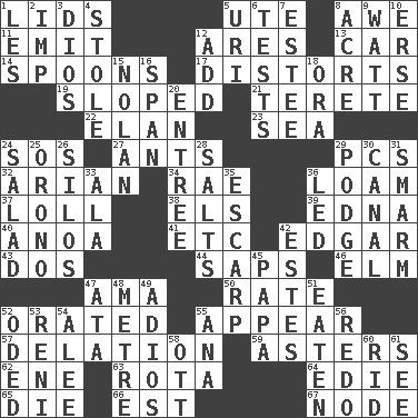 ACROSS 1. Flaplike coverings 5. Shoshoni 8. Deep reverence 11. Give off 12. Ancient Greek god of war 13. 4-wheeled motor vehicle 14. Soup utensils 17. What propaganda does 19. Had an oblique or slanted direction 21. Cigar-shaped 22. Liveliness 23. Ocean 24. Distress signal 27. Pismires 29. Personal Computers (abbr.) 32. Believer in; advocate of (suffix) 34. Actress Charlotte 36. Rich soil 37. Hang loosely or laxly 38. Raised railways 39. Pulitzer Prize-winning author Ferber 40. Small Philippine buffalo 41. And so on (abbr.) 42. _ Allan Poe 43. Two (Sp.) 44. Plant excrements 46. Shade tree 47. Nursemaid (var.) 50. Pace 52. Spoke pompously 55. Become visible 57. Accusation by an informer 59. Michaelmas daisies 62. Compass dir. 63. Round or rotation of duties 64. Singer Brickell 65. Pass on 66. Eastern Standard Time (abbr.) 67. Thickened enlargement DOWN 1. French article 2. Naughty child 3. "Vaya con ____" 4. Fur scarf 5. RI univ. 6. Trials 7. First name in cosmetics 8. 43,560 square feet 9. Electrical Unit 10. Celtic language 12. Find the sum of 15. Pitcher Ryan 16. Connect, as a bridge 18. Mouth or opening 20. Main course 24. Vegetable dish 25. U. of Maine site 26. Grain storage towers 28. Table seasonings 29. Puddle 30. Lessep's creation 31. Excessive but superficial compliments 33. Wing 35. Fortification 36. Directed 42. _____ Park, CO 45. Dad 47. _ moment's notice (2 wds.) 48. Distance measurement (Brit.) 49. Goodbye (Sp.) 51. Eroded 52. Wrote a lyric poem 53. Painter Guido (1575-1642) 54. Toward shelter 55. Santa ___, CA 56. Redecorate 58. Baseball player Mel 60. To free from 61. Observe