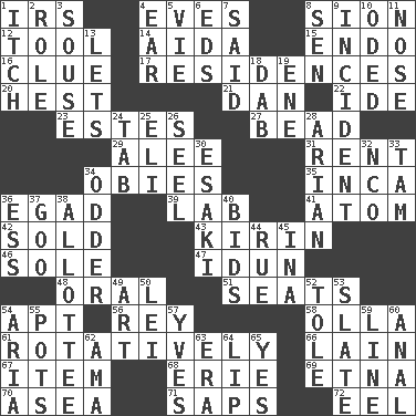 ACROSS 1. Big collection agency 4. Nights before holidays 8. The Jewish people; Israel 12. Instrument 14. Opera by Verdi 15. Inside; within (prefix) 16. A slight indication 17. Dwellings 20. Behest 21. One of the 12 tribes of Israel 22. Binary compound 23. _____ Park, CO 27. Necklace unit 29. Toward shelter 31. Monthly bill 34. Off-Broadway awards 35. South American Indian 36. Mild oath 39. Experiment locale 41. Tiny particle 42. Disposed of to a purchaser 43. Japanese brewing company 46. Not divided or shared with others 47. Goddess of spring and wife of Bragi 48. Taken by mouth 51. Theater features 54. Fitting 56. Marina Del _, California 58. Water jar 61. Happening in regular succession 66. (Had) reclined 67. A distinct part 68. 4th largest of the Great Lakes 69. Inactive volcano in Sicily 70. Toward the sea 71. Plant excrements 72. Snakelike fish DOWN 1. Hankering 2. Hero or heavy, e.g. 3. Boozer 4. Ewer handle 5. Compete 6. Begley and Asner 7. Alleged 8. Elected rep. 9. Event 10. Wrote a lyric poem 11. Characteristic smell of wine 13. Allows 18. Small moist lump or mass 19. Compass dir. 24. Keyboard key 25. Connecticut Ivy Leaguer 26. Stitch closed the eyes of (a falcon) 28. Believer in; advocate of (suffix) 30. 1973 Nobel Price Winner (Physics) Leo 32. Non-commissioned officer (abbr.) 33. Scottish cap 34. More peculiar 36. Curvy letter 37. Thick or sticky substance 38. One to whom something is allotted 40. Auction offers 44. Regret 45. _ tizzy (2 wds.) 49. Nonscientific branch of learning 50. Luau accessory 52. Lacquered or enameled metalware 53. Chalkboard 54. Roberta Peters solo 55. Plant holders 57. Jacques Cousteau's middle name 59. Actor's bit 60. Of or related to the anus 62. Nursemaid (var.) 63. Epoch 64. Mouth edge 65. Affirmative reply