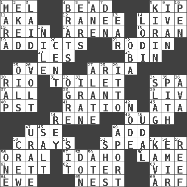 ACROSS 1. Cartoonist voice _ Blanc 4. Necklace unit 8. Sleep 11. Alias (abbr.) 12. Indian princess (variant) 14. Moving, as bait 15. It's straight from the horse's mouth 17. Sports stadium 18. Northwest Algerian city 19. Inveterate users 21. "The Thinker" sculptor 23. French article 24. Storage container 25. Baking chamber 27. Operatic vocal solo 30. _ de Janeiro 31. Rest room 34. Health resort 37. 100% 38. Monetary aid 39. 54 in ancient Rome 40. Pacific Standard Time (abbr.) 41. Food allowance for one day 43. "One Day ___ Time" 44. French philosopher Descartes 45. Ending for "Through" and "Enough" 47. Purpose 49. Increase 50. Trading vessels 52. Orator 56. Spoken 57. Potato state 60. Unable to walk 61. Remaining after all deductions 62. Carrier 63. Compete 64. She-sheep 65. A home for chicks 66. Sandy's bark DOWN 1. Hindu Mythology: god of death 2. Made supply last 3. Put down 4. Naughty children 5. Hearing organs 6. One (Scot) 7. Lair 8. Japanese brewing company 9. _ the terrible 10. Writing instrument 13. Hearing organ 14. Farming town in central California 16. The longest river in the world 20. Penny 22. Chief or king in Benin or Nigeria 25. Lubricates 26. Electrical Unit 27. Having winglike extensions 28. Painter Guido (1575-1642) 29. "Tell ____ the Marines!" 30. Strike 32. Legendary monster 33. SW Asia republic 34. Volcanic refuse 35. Essential or central part 36. Actress Gardner 42. Connecting point 44. Marina Del _, California 46. Hereditary estate 47. A salt of uric acid 48. Table seasoning 49. To the left, to Queeg 50. Ship's personnel 51. Be seated 52. "______ My Girl" (Turtles hit) 53. Polynesian shrub of the pepper family 54. Arab leader 55. Coral collection 56. Single 58. Spanish title 59. Had dinner
