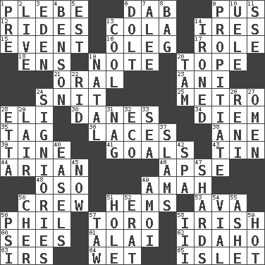 ACROSS 1. Military trainee 6. Pat or tap gently 9. Purulenc 12. Amusement-park features 13. Root beer relative 14. Angers 15. Happening 16. Cassini of fashion 17. Hero or heavy, e.g. 18. Followers of ems 19. Make mention of 20. Drink excessively 21. Of the mouth 23. Cuckoo 24. In a ____ (agitated or irritated) 25. Paris' subway 28. Biblical high priest 30. Natives or inhabitants of Denmark 34. South Vietnam president (1954) 35. Label 36. Shoestrings 38. A saturated hydrocarbon 39. Prong on a fork 41. Purposes of endeavors 43. Metal container 44. Believer in; advocate of (suffix) 46. Domed church section 48. Bear (Spanish) 49. Wet nurse 50. Ship's personnel 51. Equivocates 53. Actress Gardner 56. Silvers or Donahue 57. "Corrida" creature 58. From or relating to Ireland 60. Perceives with the eye 61. Mountain range southwest of Kyrgyzstan 62. Potato state 63. Big collection agency 64. Dripping 65. Small island DOWN 1. Before (prefix) 2. Not recorded 3. Locale of original sin 4. Gillaume's butler role 5. Eastern Standard Time (abbr.) 6. Stupid person 7. Toward shelter 8. Paper or plastic container 9. Conciliate 10. Ubangi River tributary 11. Compass dir. 13. Calm and collected 14. Pressed 19. Relating to or accompanying birth 20. Scottish cap 22. To free from 24. Seigniories (variant) 26. Painter Guido (1575-1642) 27. Sign of something about to happen 28. Singer James 29. Den 31. Tired old horse 32. Environmental prefix 33. Ocean 37. Criticizes harshly 40. Artist's stands 42. Health resort 45. Immediately 47. Broken pieces 49. Mine, in Marseilles 50. "Mermaids" star 51. Opening into or through something 52. Part of Q.E.F. 54. Small bottle 55. American tennis player Robert 56. Air pressure measure (abbr.) 57. The 23rd letter of the Hebrew alphabet 58. One more than two 59. Being at a high temperature