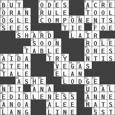ACROSS 1. On the contrary 4. Lyric poems 8. 1/640 square mile 12. Northwest Algerian city 14. Court order 15. Utensil 16. Stare at amorously 17. Parts 20. Perceives with the eye 21. Standoff 22. Enemy 23. Broken piece 27. Den 29. Within a short period 31. Hero or heavy, e.g. 34. Eating place 35. Singles 36. Opera by Verdi 39. Attempt to accomplish something 41. Nuclear Threat Initiatives 42. A distinct part 43. Viva Las _ 46. Lie 47. Enthusiasm 48. American tennis player Robert 51. Inn 54. Fish or hair follower 56. Santa ___, CA 58. Allodial 61. The property of being fit to eat 66. Queen of England 1702-14 67. Small Philippine buffalo 68. Toward shelter 69. Floor coverings 70. Long (Scottish) 71. Actor's bit 72. Fast jet (abbr.) DOWN 1. Scornful sounds 2. Goad 3. Lies 4. The grampus (Milton) 5. Superhero pair 6. Shade tree 7. Back-to-school mo. 8. Had dinner 9. Meet 10. Printing process, for short 11. Otherwise 13. Delicate 18. Petroleum 19. Teachers' org. 24. White ___ sheet 25. Director Reiner 26. Stupid person 28. Metal shackles 30. Effrontery 32. Flowery wreath 33. Double-curved letter 34. Makes less strong or intense 36. Small island 37. Call ___ day 38. Conveyance 40. Shout 44. E Mali city 45. Added to 49. Actor Linden 50. Compass dir. 52. Island territory of the United States 53. Ferber et al. 54. Actress Patricia 55. Pulitzer Prize-winning author Ferber 57. Of or related to the anus 59. Pismires 60. For fear that 62. Paper or plastic container 63. Connecticut Ivy Leaguer 64. Elected rep. 65. Observe