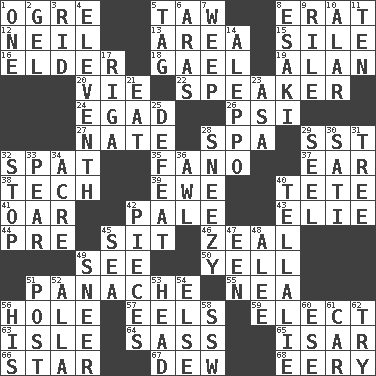 ACROSS 1. Legendary monster 5. The 23rd letter of the Hebrew alphabet 8. Part of Q.E.F. 12. Famous astronaut Armstrong 13. Type of rug 15. Drop; flow; fall 16. A person who is older than you are 18. Highlander 19. ____ Jay Lerner 20. Compete 22. Orator 24. Mild oath 26. 23rd letter of the Greek alphabet 27. Nathan's nickname 28. Health resort 29. Fast jet (abbr.) 32. Argument over a trivial matter 35. Papal veil 37. Ewer handle 38. Georgia ____ (Atlanta school) 39. She-sheep 40. Wig 41. Boat paddle 42. Diluted with white 43. Writer Wiesel 44. Before (prefix) 45. Be seated 46. Ardor 49. Perceive with the eye 50. Shout 51. Flamboyance 55. Teachers' org. 56. Opening into or through something 57. Snakelike fish 59. Voters do this 63. Small island 64. Backtalk 65. Austrian river, tributary to the Danube 66. Play the lead 67. Morning condensation 68. Suggestive of the supernatural DOWN 1. Single 2. Set 3. To free from 4. Veterans Day date 5. Label 6. Caspian sea tributary 7. Shed a tear 8. 1973 Nobel Price Winner (Physics) Leo 9. Cause heat under the collar 10. Having or resembling wings 11. Nine, plus one 14. City in Syria 17. Capital of Latvia 21. Erode 23. White ___ sheet 25. Outscore 28. Dwarf with a sinus problem 29. Sew up the eyelids of hawks and falcons 30. Suttee (variant) 31. Relationship diagram 32. Constrict 33. Lightbulb-shaped fruit 34. 1/640 square mile 36. Leather borer 40. Copy Pinocchio 42. Parts 45. Ocean 47. Car or cant ending 48. Toward shelter 49. Contemptuous expression 51. Mail 52. Silent film actress Nazimova 53. Froth on beer 54. Otherwise 56. Part of HMS, perhaps 58. Compass dir. 60. Compass dir. 61. Automobile 62. Attempt