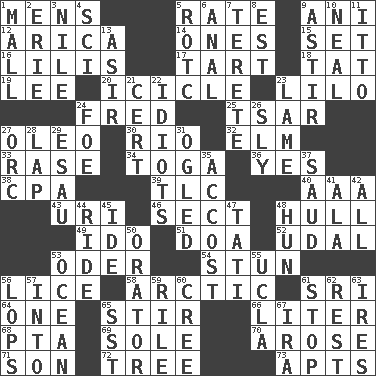 ACROSS 1. Not women's 5. Assign a rank or rating to 9. Cuckoo 12. N. Chile seaport 14. Singles 15. Put into a specified state 16. Ms. Damita and namesakes 17. Small pie 18. Make lace 19. Area sheltered from the wind 20. Hanging ice 23. _ and Stitch 24. Flintstone 25. Russian ruler of old 27. Margarine 30. River (Sp.) 32. Shade tree 33. Raze (variant) 34. Ancient Roman robe 36. Consenting reply 38. Numbers guy (abbr.) 39. Affectionate concern, for short 40. American Automobile Association (abbr.) 43. RI univ. 46. Religious group 48. Frame or body of a ship 49. Wedding promise 51. ___ good deed 52. Allodial 53. River in Europe 54. Astound 56. Louse (plural) 58. Northern region 61. _ Lanka 64. Single 65. Disorderly outburst 66. 61 cubic inches 68. Parent Teacher Association (abbr.) 69. Flatfish 70. Came up 71. Male child 72. Relationship diagram 73. Flats, for short DOWN 1. Shopping center 2. One of the Great Lakes 3. Mediterranean tributary 4. _-fi 5. College mil. group 6. Of or related to the anus 7. Cylindrical with tapered ends 8. Eastern Standard Time (abbr.) 9. Having gotten out of bed 10. Be tempered by heat 11. "Tell ____ the Marines!" 13. SW Saudi Arabia district 21. An absolute certainty 22. Foolish or stupid persons 23. Unable to walk 24. Enemy 26. Wily 27. The grampus (Milton) 28. Infant locale 29. Son of Isaac 31. Stared 35. Buttonhole 37. Saudi Arabian king (1953-1964) 41. Wing 42. 100% 44. Travel on or in a vehicle 45. Binary compound 47. Jacques of French films 48. Attila the _ 50. Speaker 53. Sea 55. Southern CA. univ. 56. Chops off 57. To the inside or interior of 59. Cause heat under the collar 60. Algonquian 61. Cease 62. Relief 63. Angers 65. Fast jet (abbr.) 67. Retirement account (abbr.)