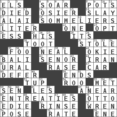 ACROSS 1. Raised railways 4. Fly high 8. Plant holders 12. Passed on 14. Flexible twig of a willow tree 16. Kill 17. Jai ____ 18. Wine waiters 20. 61 cubic inches 22. Single 23. Choose 24. Curvy letter 25. Part of HMS, perhaps 28. It is 30. A blast of a horn 31. Fur scarf 35. Egg _ yung 37. Anneal 40. Migrant worker of the '30s 41. Indonesian resort city 42. Sir (Sp.) 44. SW Asia republic 45. Mountain range 46. Raze (variant) 47. Auto 48. Postpone 50. Extremities 52. Uncastrated adult male sheep 54. Friend of Pooh 55. Was introduced to 58. Elected rep. 61. French article 63. Approach 65. Pleas 70. Von Bismarck 71. Singer Brickell 72. Wash lightly 73. Songbird 74. Airs 75. Pace 76. Compass dir. DOWN 1. Peak District village in England 2. Ms. Damita and namesakes 3. Theater features 4. Distress signal 5. Bear (Spanish) 6. Direct toward a target or goal 7. San ____ (Riviera town) 8. Air pressure measure (abbr.) 9. Margarine 10. Canvas cover 11. System (abbr.) 13. Expire 15. Painter Guido (1575-1642) 19. Allows 21. 17th letter of the Greek alphabet 26. Charged particles 27. Navigate 29. Unemotional ones 30. Bathroom 32. Gumbo ingredient 33. One who doesn't tell the truth 34. Car or cant ending 35. Conductor's collection 36. Norwegian king 38. Santa ___, CA 39. Failure 41. Partially opened flower 43. Western Nevada city 49. Governing power 51. ___ good deed 53. Lightbulb-shaped fruit 55. Distance measurement (Brit.) 56. Consumed 57. Marketplace scale 58. Ooze 59. Inside; within (prefix) 60. Nuclear Threat Initiatives 62. Agitate 64. Immediately 66. To riddle 67. _ tizzy (2 wds.) 68. Eastern Standard Time (abbr.) 69. Perceive with the eye