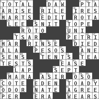 ACROSS 1. "_____ Recall" 6. Fool 9. Parent Teacher Association (abbr.) 12. Get up 13. Cause heat under the collar 14. Angers 15. Shops 16. Prepare for publication 17. Round or rotation of duties 18. Area sheltered from the wind 19. In a ____ (agitated or irritated) 20. Drink excessively 21. Printing process, for short 23. Single; one (prefix) 24. Russian ruler of old 25. _ dish (used to culture cells) 28. Impair 30. Remove soap 34. Passed on 35. Wing 36. Mexican monetary units 38. A saturated hydrocarbon 39. Elected reps. 41. Portable shelters 43. Beverage made from leaves 44. Trials 46. Comfort 48. Infant locale 49. Back-to-school mo. 50. Hindu Mythology: god of death 51. SW Saudi Arabia district 53. Bear (Spanish) 56. ____ d'Azur (French Riviera) 57. Genesis locale 58. Sycophant 60. Scent 61. Nathan's nickname 62. Match 63. For each 64. Epoch 65. Puts on (as clothing) DOWN 1. Scottish cap 2. Spoken 3. Become fatigued 4. Michaelmas daisies 5. French article 6. "You Light Up My Life" star Conn 7. Set down 8. Soggy 9. Appease 10. Wig 11. White ___ sheet 13. Former U.S. Attorney General Janet 14. Pressed 19. Long narrow piece of something 20. Uncastrated adult male sheep 22. Boat paddle 24. Interpreter 26. French philosopher Descartes 27. The content of cognition 28. Vertical spar for supporting sails 29. Toward shelter 31. Fish or hair follower 32. Compass dir. 33. Age 37. Bull 40. A viewer who gazes fixedly 42. Plant excrement 45. Health resort 47. Moe Howard, for one 49. Trig term 50. Method 51. The sixth month of the Jewish calendar 52. Bristle 54. "Two Mules for Sister ____" 55. Baltic tributary 56. Police officer (slang) 57. Compass dir. 58. The 23rd letter of the Hebrew alphabet 59. Affirmative reply