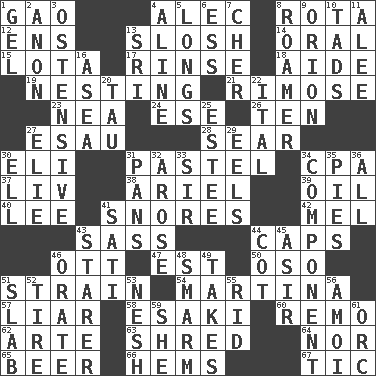ACROSS 1. E Mali city 4. Actor Baldwin 8. Round or rotation of duties 12. Followers of ems 13. Splash clumsily 14. Relating to the mouth 15. Globular water bottle used in Asia 17. Wash lightly 18. Assistant 19. Inhabiting a nest 21. Full of chinks, cracks, or crevices 23. Teachers' org. 24. Compass dir. 26. "___ Little Indians" 27. Son of Isaac 28. Dry up 30. Connecticut Ivy Leaguer 31. Soft color 34. Accounting whiz (abbr.) 37. 54 in ancient Rome 38. Satellite of Uranus 39. Lubricate 40. Area sheltered from the wind 41. Sounds asleep 42. Cartoonist voice _ Blanc 43. Backtalk 44. Smile enhancers 46. Baseball player Mel 47. Eastern Standard Time (abbr.) 50. Bear (Spanish) 51. Put through a sieve 54. Chrissie's court nemesis 57. One who doesn't tell the truth 58. 1973 Nobel Price Winner (Physics) Leo 60. San ____ (Riviera town) 62. Johnson of "Laugh-In" 63. Tear up 64. Or not 65. Fermented drink made from hops 66. Cloth borders 67. Nervous spasm DOWN 1. Set 2. At once, immediately (arch.) 3. Clearly or manifestly demonstrative 4. Place in a line 5. Yearns 6. Curvy letter 7. "Mermaids" star 8. Nomad 9. Greek mythologigal hunter 10. Bits 11. Toward shelter 13. Indian title of respect (Mr.) 16. At sea 20. The 19th letter of the Greek alphabet 22. Slanted text style (abbr.) 25. First name in cosmetics 27. Writer Wiesel 29. Snakelike fish 30. Pipe bend 31. Zero-star reviews 32. Came up 33. Title for a knight 34. Part 35. Sliced desserts 36. Everything 41. Suttee (variant) 43. A viewer who gazes fixedly 44. Small bed 45. SW Saudi Arabia district 46. Speak pompously 48. Excessive but superficial compliments 49. Receives possession of 51. Broad, flat, thick piece 52. Become fatigued 53. Delicate 55. To free from 56. Mine, in Marseilles 59. A female animal or person 61. The grampus (Milton)