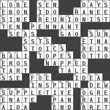 ACROSS 1. Ear part 5. Elected rep. 8. 24-hour periods 12. Inky black, to poets 13. Wedding promise 14. Indian princess (variant) 15. Trig term 16. One who advocates reunion 19. Nine, plus one 20. Pre-World Series prize 21. Oceans 23. E Mali city 24. Player for Phoenix 27. Fast planes 30. Inactive volcano in Sicily 31. Unemotional ones 34. It's straight from the horse's mouth 35. Indonesian resort city 38. Drinks excessively 40. Von Bismarck 41. Greek god of love 42. Slept 44. Small pie 45. Lie 46. Compass dir. 47. Enemy 50. The content of cognition 53. Stimulate to action 57. Morning condensation 59. Supplementary 63. Legendary monster 64. Maternal 65. Baking dish 66. Precipitation 67. Opera by Verdi 68. Conclude 69. Cy Young winner Saberhagen DOWN 1. For fear that 2. Off-Broadway awards 3. Child's nurse 4. Compass dir. 5. The founder of a family 6. Locale of original sin 7. Part of speech 8. One of the 12 tribes of Israel 9. Black tropical American cuckoo 10. It is so 11. Put into a specified state 14. Printing process, for short 17. Tired old horse 18. _ tizzy (2 wds.) 20. Inconspicuous attention getter 22. Help 24. Proofreading order 25. A single undivided whole 26. Billionth: prefix 28. Small child 29. The Jewish people; Israel 30. Eaten away 32. Accounting whiz (abbr.) 33. Back-to-school mo. 35. Antes 36. Ancient river in northeast Turkey 37. Old wives' tales, e.g. 39. Health resort 43. Writer Wiesel 47. Do some clerical work 48. Single 49. Eastern Standard Time (abbr.) 51. _ Allan Poe 52. Nest on high 54. Corncob 55. "Terrible" tsar 56. Tear apart 58. Left 59. Ocean 60. Single; one (prefix) 61. Groovy apt. 62. Parent Teacher Assoc. 63. Globe