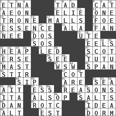ACROSS 1. Inactive volcano in Sicily 5. Small boy 8. Domesticated feline 11. A really long time 12. Writer Wiesel 14. Single 15. Marketplace scale 17. Promenades 18. Enemy 19. Substance 21. Insect wing 22. Avid follower 23. Born 24. Two (Sp.) 25. Shoshoni 27. Distress signal 28. Snakelike fish 31. Pile 35. Directed 37. Native of Scotland 38. Celtic language 39. Perceive with the eye 41. Ballerina skirt 42. Vertical spar for supporting sails 43. Compass dir. 45. Connect, as a bridge 46. Use a swizzle stick 47. Small bed 49. Small drink 51. "We ___ not amused" (Victoria) 52. Ocean 55. Small island 57. Double-curved letter 60. Thinks logically 62. Call ___ day 63. Columnist Joseph or Stewart 65. Table seasonings 66. Daniel's nick name 67. College mil. group 68. The main thing one is thinking about 69. The first octave above the treble staff 70. Eastern Standard Time (abbr.) 71. Dormintory (informal) DOWN 1. Consumed 2. Laconic 3. Trap for birds or small mammals 4. Singer Murray 5. Afternoon social gathering 6. Silent film actress Nazimova 7. Deli pickle 8. Java holder (2 wds.) 9. Small Philippine buffalo 10. Adolescent 13. He sold his birthright 16. Extremities 17. Makes clutter 20. Calm and collected 26. Trials 29. Globular water bottle used in Asia 30. Make senseless or dizzy 31. Is hesitant and indecisive 32. Part of Q.E.F. 33. Helper 34. _ dish (used to culture cells) 36. Morning condensation 40. Fortification 44. Had on 48. Beverages made from leaves 50. Lightbulb-shaped fruit 52. Twentieth part of a lira 53. Keyboard key 54. Indian state 55. Opera by Verdi 56. Slanted text style (abbr.) 58. A type of plum 59. Fast planes 61. Alleged 64. Sep. follower