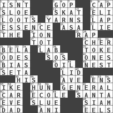 ACROSS 1. Is not 5. Grand Old Party 8. Head covering 11. A type of plum 12. Three-handed card game 14. Connecticut Ivy Leaguer 15. Plunders 17. Tall tales 18. Pet locale 19. Core 21. White ___ sheet 22. Falsehood 23. Definite Article 24. Electrically charged atom 25. Strike 27. Small child 28. "Mermaids" star 31. Actor Lugosi 35. Experiment locale 37. Puff or smoke 38. Lyric poems 39. Distress signal 41. Singles 42. Prejudice 43. Lubricate 45. Egg locale 46. Bristle 47. Flaplike covering 49. Part of HMS, perhaps 51. "___ Maria" 52. Followers of ems 55. Mamie's husband 57. Attila the _ 60. Commissioned military rank 62. Auto 63. Learning spot: Fr. 65. Before Barbara or Clara 66. First lady 67. Turn sharply 68. Thailand, formerly 69. Male parent 70. Black tropical American cuckoo 71. Snakelike fish DOWN 1. Small island 2. Make a splashing sound 3. Trap for birds or small mammals 4. Wig 5. Girls' org. (abbr.) 6. Gumbo ingredient 7. Baking dishes 8. Portable communications device 9. Mountain range southwest of Kyrgyzstan 10. Corncob 13. Russian ruler of old 16. In a ____ (agitated or irritated) 17. Gossips 20. Calm and collected 26. 13-14th century defensive garment 29. Makes supply last 30. State of inaction 31. Moves up and down 32. Singer Brickell 33. Tough but pliablecoriaceous 34. Slender Brazilian palm 36. Sometimes accompanies a hiss 40. Fodder prepared in a silo 44. Not recorded 48. Hiding places for outlaws 50. "______ My Girl" (Turtles hit) 52. Bert's buddy 53. Brizilian seaport 54. Shuts with force 55. On the rocks 56. Polynesian shrub of the pepper family 58. Southern CA. univ. 59. Part of speech 61. Comfort 64. Luau accessory
