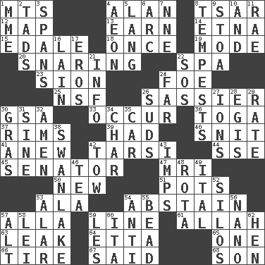 ACROSS 1. Mountains (abbr.) 4. ____ Jay Lerner 8. Russian ruler of old 12. Atlas unit 13. Merit 14. Inactive volcano in Sicily 15. Peak District village in England 18. Single time 19. Method 20. Catching in a trap 22. Health resort 23. The Jewish people; Israel 24. Enemy 25. Science/research agcy. 26. More lively and spirited 30. Girls' org. (abbr.) 33. Come to pass 36. Ancient Roman robe 37. Basketball hoops 39. Possessed 40. In a ____ (agitated or irritated) 41. Afresh 42. Tarsus (plural) 44. Compass dir. 45. Elected representative 47. Medical imaging device (abbr.) 50. ___ Haven, CT 51. Plant holders 53. Chicken ___ king 54. Refrain by choice 57. Silent film actress Nazimova 59. Actor's bit 61. Assad's deity 63. Path through which fluid escapes 64. Singer James 65. Single 66. Hoop that covers a wheel 67. Expressed in words 68. Manchild DOWN 1. Madame (abbr.) 2. Small boys 3. Connects, as a bridge 4. Age 5. Austrian-born American filmmaker Fritz 6. Curve 7. Compass dir. 8. Storms 9. Portico 10. Also 11. Actress Charlotte 16. (Had) reclined 17. Greek god of love 21. A message received and understood 22. Distress signal 24. Distant 26. Beer foam 27. Charged particles 28. The front part of a cuirass 29. Pace 30. Pate de foie ____ 31. Trig term 32. So be it 34. Burn to charcoal 35. 4-wheeled motor vehicle 38. Tchaikovsky ballet 42. Pull behind 43. Naughty children 46. Beverage made from leaves 48. Roll call or roster of names 49. Slanted text style (abbr.) 52. Grain storage towers 53. Having or resembling wings 54. Against 55. Necklace unit 56. Billionth: prefix 57. Keyboard modifier key 58. Flowery wreath 59. French article 60. Call ___ day 62. Layer