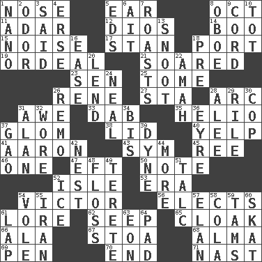 ACROSS 1. Olfactory organ 5. Ewer handle 8. Sep. follower 11. The sixth month of the Jewish calendar 12. "Vaya con ____" 14. Surprise greeting 15. Annoying sound 17. Comedian Laurel of Laurel & Hardy 18. Sweet dark-red dessert wine 19. Severe or trying experience 21. Flew 23. Elected rep. 25. Heavy book 26. French philosopher Descartes 27. R.R. building 28. Curve 31. Deep reverence 33. Pat or tap gently 35. Sun: prefix 37. Seize upon or latch onto something 38. Hat (slang) 40. Sharp bark 41. Composer Copland 43. Symbol (abbr.) 45. To sift 46. Single 47. Bank Draft (abbr.) 50. Make mention of 52. Small island 53. Epoch 54. Winning man's name 56. Chooses 61. Old wives' tales, e.g. 62. Ooze 65. Hide under a false appearance 66. Chicken ___ king 67. Portico 68. _ mater 69. Animal enclosure 70. Conclusion 71. Political cartoonist Thomas DOWN 1. Billionth: prefix 2. Aroma 3. Alleged 4. Celtic language 5. Begley and Asner 6. Small island 7. Exposes to great heat 8. Mitch Miller's instrument 9. Drawstring 10. Small child 13. Snob 16. Relaxation 18. Before (prefix) 20. Grant temporary use of 22. Nanny 24. Anneal 26. San ____ (Riviera town) 28. Toward shelter 29. Cause heat under the collar 30. Police officer (slang) 31. ____ Jay Lerner 32. Had on 34. Again 36. Jane of fiction 37. E Mali city 39. Centimeter-gram-second unit of force 42. A home for chicks 44. Greater amount 48. Soft thread for cleaning between teeth 49. Cigar-shaped 51. Baby powder 52. Frozen water 54. Short-tailed, large-bodied rat 55. SW Asia republic 57. Enthusiasm 58. Root beer relative 59. Scottish caps 60. Three-handed card game 61. Infant locale 63. Age 64. Writing tablet