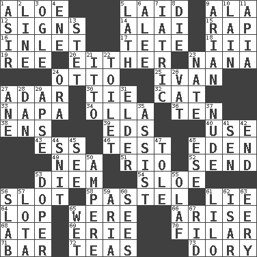 ACROSS 1. _ vera 5. Put down 9. Insect wing 12. Omens 14. Jai ____ 15. Hit sharply and swiftly 16. An arm off of a larger body of water 17. Wig 18. One more than two 19. Portuguese money of account (variant) 20. One or the other of two 23. Grandmother 24. "Beetle Bailey" pooch 25. _ the terrible 27. The sixth month of the Jewish calendar 30. Neckwear 32. Feline 33. California wine valley 34. Rounded earthenware pot or jar 36. "___ Little Indians" 38. Followers of ems 39. Begley and Asner 40. Purpose 43. Double-curved letter 46. Trial 48. Locale of original sin 49. Teachers' org. 51. _ de Janeiro 52. Post 53. South Vietnam president (1954) 54. _ gin 56. Notch 58. Soft color 61. Whopper 64. Chop off 65. Past tense of be (plural) 66. Ascend 68. Had dinner 69. One of the Great Lakes 70. Of or pertaining to a thread or threads 71. Oblong piece of solid material 72. Afternoon social gatherings 73. Rowboat DOWN 1. SW Saudi Arabia district 2. Actor's bit 3. Stare at amorously 4. Compass dir. 5. Thin strip of wood or metal 6. Toward shelter 7. Of or pertaining to medicine 8. Expire 9. Believer in; advocate of (suffix) 10. (Had) reclined 11. Capital of Western Samoa 13. Proofreading order 21. "Tell ____ the Marines!" 22. Rest room 23. Nathan's nickname 24. Mouth or opening 26. Large container 27. A saturated hydrocarbon 28. Daniel's nick name 29. Domed church section 31. A person who is older than you are 35. Aid 37. Unadorned 41. Elected rep. 42. Conclusion 44. In a ____ (agitated or irritated) 45. Perceive with the eye 47. Lacquered or enameled metalware 48. Compass dir. 50. Electrical Unit 53. Drug addict 55. Norwegian king 56. Thick slice 57. Globular water bottle used in Asia 59. Roberta Peters solo 60. Perceives with the eye 61. _ and Stitch 62. Austrian river, tributary to the Danube 63. Suggestive of the supernatural 65. Soggy 67. To free from