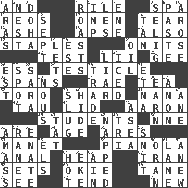 ACROSS 1. Plus 4. Cause heat under the collar 8. Health resort 11. Vintage cars 13. Sign of something about to happen 14. Rend 15. American tennis player Robert 16. Domed church section 17. In addition 18. Paper fasteners 21. Leaves out 22. Trial 23. Cards in a Roman deck? 25. Unit of force equal to gravity 26. Double-curved letter 29. A testis 32. Connects, as a bridge 34. Actress Charlotte 35. Beverage made from leaves 38. "Corrida" creature 39. Pottery fragment 41. Grandmother 43. The 19th letter of the Greek alphabet 44. Flaplike covering 45. Composer Copland 46. SAT takers 50. Compass dir. 51. "We ___ not amused" (Victoria) 54. Personal question 55. Ancient Greek god of war 57. French painter Edouard 59. Player piano 63. Of or related to the anus 64. Pile 67. SW Asia republic 68. Puts into a specified state 69. Migrant worker of the '30s 70. Docile 71. Observe 72. Watch over 73. ___ Haven, CT DOWN 1. Ancient river in northeast Turkey 2. Egg locale 3. Capital of the state of Qatar 4. Cooks with dry heat, as in an oven 5. Mischievous child 6. French article 7. Compass dir. 8. Former Milwaukee Brewers owner Bud 9. Thick mixture 10. Came up 12. Back-to-school mo. 14. Scottish cap 19. Allows 20. Compass dir. 21. Lubricate 23. One who doesn't tell the truth 24. On the rocks 26. Eastern Standard Time (abbr.) 27. Specific locale 28. "Two Mules for Sister ____" 30. Swap 31. Inactive volcano in Sicily 33. Good sense 36. Merit 37. Soon (poet.) 39. Snaillike creature with no shell 40. Flintstone garb 42. One (Scot) 45. Toward the sea 47. Make lace 48. Slept 49. Three (prefix) 51. Collect or gather 52. Indian princess (variant) 53. Related on the mother's side 56. In a ____ (agitated or irritated) 58. Raised railways 60. Northwest Algerian city 61. Unable to walk 62. Afresh 64. Being at a high temperature 65. Supplement with great effort 66. The 18th letter of the Arabic alphabet