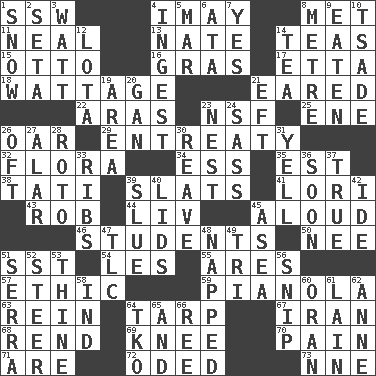 ACROSS 1. Compass dir. 4. "If ____ say so..." 8. Was introduced to 11. Anneal 13. Nathan's nickname 14. Afternoon social gatherings 15. Von Bismarck 16. Pate de foie ____ 17. Singer James 18. Electrical Measurement 21. Having ears or earlike features 22. Caspian sea tributary 23. Science/research agcy. 25. Compass dir. 26. Boat paddle 29. Plea 32. Plants 34. Curvy letter 35. Eastern Standard Time (abbr.) 38. Jacques of French films 39. Narrow boards 41. Australian parrot (variant) 43. Director Reiner 44. 54 in ancient Rome 45. Verbally 46. SAT takers 50. Born 51. Fast jet (abbr.) 54. French article 55. Ancient Greek god of war 57. Moral principle 59. Player piano 63. It's straight from the horse's mouth 64. Canvas cover 67. SW Asia republic 68. Tear apart 69. Leg joint 70. Ache 71. "We ___ not amused" (Victoria) 72. Wrote a lyric poem 73. Compass dir. DOWN 1. Overwhelm 2. Bristle 3. Electrical Unit 4. Eat 5. Make imperfect 6. "One Day ___ Time" 7. It is so 8. Distance measurement (Brit.) 9. Eroded 10. Sadhe (variant) 12. Globular water bottle used in Asia 14. Beverage made from leaves 19. Length times width 20. Separate the seeds from cotton 21. Lizard (obsolete) 23. A home for chicks 24. Backtalk 26. Often (poetically) 27. Having or resembling wings 28. Printing process, for short 30. Break or tear apart 31. Shout 33. Teases 36. Within a short period 37. Loyal 39. Turn sharply 40. Hats (slang) 42. Binary compound 45. At sea 47. Affectionate concern, for short 48. Slept 49. Three (prefix) 51. Spanish missionary in California 52. Guide 53. One or ones belonging to thee 56. Clip 58. Working for oneself (abbr.) 60. Northwest Algerian city 61. (Had) reclined 62. Singer Murray 64. Ring climax 65. Also 66. To separate or throw off