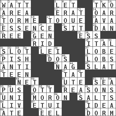 ACROSS 1. Electrical Unit 5. Allow 8. Ring climax 11. Length times width 12. Part of Q.E.F. 14. Rowing implement 15. Singer Mel 17. Woman's close-fitting hat 18. Actress Gardner 19. Gist 21. Be seated 22. One of the 12 tribes of Israel 23. To sift 24. Commissioned military rank (abbr.) 25. Curvy letter 27. To free from 28. Slanted text style (abbr.) 31. Narrow, elongated depression 35. Luau accessory 37. Ear part 38. Expression of disdain 39. Two (Sp.) 41. Tennis shots 42. Opposed to 43. Tired old horse 45. Narrow board 46. Adolescent 47. Make lace 49. Fish or hair follower 51. Shoshoni 52. Ocean 55. Fluid product of inflammation 57. Baseball player Mel 60. Thinks logically 62. Single; one (prefix) 63. Person of subnormal intelligence 65. Table seasonings 66. 54 in ancient Rome 67. Needle case 68. It may be bright or harebrained 69. Had dinner 70. Snakelike fish 71. Dormintory (informal) DOWN 1. Wetness 2. Came up 3. Laconic 4. Not wild 5. Lion 6. Greek god of love 7. "Change" in Tahitian 8. Inedible or poisonous agaric 9. Polynesian shrub of the pepper family 10. NW Algerian seaport 13. False hair 16. Engineer (abbr.) 17. Looked after 20. To provide with a ceiling 26. Beverly of Met fame 29. Swedish rock group 30. For fear that 31. Petty quarrel 32. Actor's bit 33. Clearly or manifestly demonstrative 34. One or ones belonging to thee 36. Electrically charged atom 40. Titan orbits this 44. Yard entry 48. Beverages made from leaves 50. Heavy book 52. Twentieth part of a lira 53. Keyboard key 54. Indian state 55. Monetary unit of Botswana 56. A single undivided whole 58. Lug 59. Loyal 61. Stated 64. Petroleum