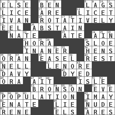 ACROSS 1. Otherwise 5. Benjamin's nick name 8. Straggles 12. Louse (plural) 13. "We ___ not amused" (Victoria) 14. It is permitted: Lat. 15. "Terrible" tsar 16. Rotating or pertaining to rotation 19. Snakelike fish 20. Refrain by choice 21. Nathan's nickname 23. Had dinner 24. The 18th letter of the Arabic alphabet 27. Israeli folk dance 30. _ gin 31. More empty; more void 34. Coop moms 35. NW Algerian seaport 38. Artist's stand 40. Remainder 41. 1994 drama film starring Jodie Foster 42. Poe poem 44. American folk hero Crockett 45. Colored 46. Mouth or opening 47. Small island 50. Small island 53. "Death Wish" actor 57. Night before a holiday 59. Census information 63. "If ____ say so..." 64. Maternal 65. Falsehood 66. Unadorned 67. French philosopher Descartes 68. Raised railways 69. Ancient Greek god of war DOWN 1. Writer Wiesel 2. Make or become more lively 3. Any of the three canals of the cochlea 4. Car or cant ending 5. Sharp remark 6. Greek god of love 7. Remaining after all deductions 8. 54 in ancient Rome 9. Adept person 10. Set 11. Filthy place 14. Actor's bit 17. Auto club (abbr.) 18. Teat (slang) 20. Period of immesurable duration 22. Without viscosity 24. Toward shelter 25. Charged atoms 26. Egg locale 28. Actress Charlotte 29. Of or related to the anus 30. Fragments 32. Compass dir. 33. Tear apart 35. Southwest Nigerian state 36. Hitchcock's "____ Window" 37. Inventor's middle name 39. Myrna of the movies 43. It's straight from the horse's mouth 47. Competent 48. Retirement account (abbr.) 49. Small child 51. Arboreal primate 52. Dodge 54. The longest river in the world 55. Earth 56. Washington bills 58. Snake ____ (dice throw) 59. For each 60. Single 61. Baking dish 62. Shoshoni 63. _ tizzy (2 wds.)