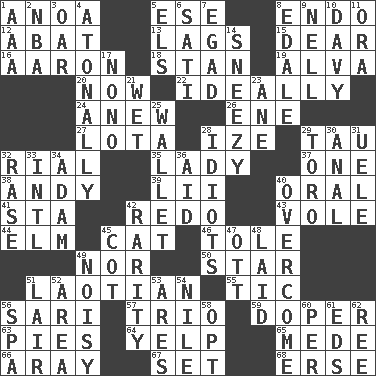 ACROSS 1. Small Philippine buffalo 5. Compass dir. 8. Inside; within (prefix) 12. Blind as ____ 13. Fails to keep up a pace 15. Letter starter 16. Composer Copland 18. Comedian Laurel of Laurel & Hardy 19. Inventor's middle name 20. At this time 22. Under perfect conditions 24. Afresh 26. Compass dir. 27. Globular water bottle used in Asia 28. Ending with capital 29. The 19th letter of the Greek alphabet 32. Monetary unit of Yemen 35. Kenny Rogers chart-topper in '80 37. Single 38. Actor Griffith 39. Cards in a Roman deck? 40. Relating to the mouth 41. R.R. building 42. Redecorate 43. Short-tailed, large-bodied rat 44. Shade tree 45. Domesticated feline 46. Lacquered or enameled metalware 49. And not 50. Play the lead 51. Of or relating to Laos or its people 55. Nervous spasm 56. Indian skirt 57. Musical group of three 59. Drug addict 63. Sliced desserts 64. Sharp bark 65. Ancient Persian 66. Like ___ of sunshine 67. Put into a specified state 68. Celtic language DOWN 1. Auto club (abbr.) 2. Basketball assoc. 3. Rowing implement 4. Without tonality 5. Raised railways 6. Suttee (variant) 7. Mild oath 8. Peak District village in England 9. 1994 drama film starring Jodie Foster 10. _ Jones' Locker 11. Mouth or opening 14. Dwarf with a sinus problem 17. Words to Nanette 21. Soggy 23. A saturated hydrocarbon 25. Place for singles 28. Foolish or stupid persons 29. "Corrida" creature 30. Of or related to the anus 31. Ubangi River tributary 32. Raze (variant) 33. International (abbr.) 34. First man 36. Assist 40. Conquer 42. Noteworthy scarcity 45. Small bed 47. Baseball player Mel 48. Put down 49. Annoyingly loud 51. Den 52. Type of rug 53. Ancient Greek god of war 54. "Death on the ____" 56. Health resort 58. Elect 60. For each 61. Begley and Asner 62. To riddle