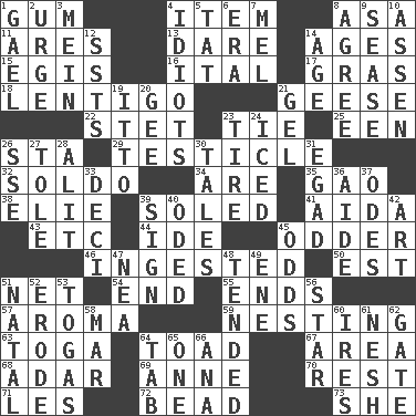 ACROSS 1. Chewing product 4. A whole individual unit 8. White ___ sheet 11. Ancient Greek god of war 13. Have the gumption 14. Ripens 15. Armor plate that protects the chest 16. Slanted text style (abbr.) 17. Pate de foie ____ 18. Small, flat, pigmented spot on the skin 21. Honkers 22. Proofreading order 23. Standoff 25. Car or cant ending 26. R.R. building 29. A testis 32. Twentieth part of a lira 34. "We ___ not amused" (Victoria) 35. E Mali city 38. Writer Wiesel 39. Having a sole or soles 41. Opera by Verdi 43. And so on (abbr.) 44. Binary compound 45. More peculiar 46. Consumed 50. Eastern Standard Time (abbr.) 51. Fish or hair follower 54. Conclude 55. Extremities 57. Odor 59. Inhabiting a nest 63. Ancient Roman robe 64. Frog relative 67. Length times width 68. The sixth month of the Jewish calendar 69. Singer Murray 70. Take ten 71. French article 72. Necklace unit 73. A female animal or person DOWN 1. Highlander 2. Goad 3. Count _ (2 wds.) 4. Foolish or stupid persons 5. Make lace 6. Period 7. Cartoonist voice _ Blanc 8. Match 9. Gospel singer Marvin 10. NE Netherlands city 12. Fast planes 14. Mature 19. "Tell ____ the Marines!" 20. Unit of force equal to gravity 21. Set 23. Become fatigued 24. On the rocks 26. Compass dir. 27. Lacquered or enameled metalware 28. Came down and settled, as after flight 30. Falsehoods 31. Mild oath 33. Tenth: prefix 36. Helper 37. Lyric poems 39. Omen 40. Wrote a lyric poem 42. Nonscientific branch of learning 45. Probability 47. Teachers' org. 48. Looked after 49. Compass dir. 51. Brizilian seaport 52. Wear away 53. Ancient Roman robes 56. Play the lead 58. Impair 60. Angers 61. Soft 62. Yard entry 64. Keyboard key 65. Single 66. Santa ___, CA
