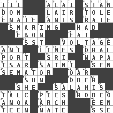 ACROSS 1. One more than two 4. Mountain range southwest of Kyrgyzstan 8. Comedian Laurel of Laurel & Hardy 12. Spanish title 13. Den 14. Lacquered or enameled metalware 15. Related on the mother's side 18. Pismires 19. Assign a rank or rating to 20. Catching in a trap 22. Possessed 23. Inky black, to poets 24. Ingest 25. Fast jet (abbr.) 26. Electrical Measurement 30. Black tropical American cuckoo 33. Citrus fruits 36. Taken by mouth 37. Left side of a ship or aircraft 39. _ Lanka 40. California wine valley 41. Russian ruler of old 42. Inhabitant of Heaven 44. Elected rep. 45. Elected representative 47. Boat paddle 50. Player for Phoenix 51. River in Europe 53. A female animal or person 54. Deli grouping 57. Baby powder 59. Sliced desserts 61. Cowboy competition 63. Small Philippine buffalo 64. Bowlike part 65. Car or cant ending 66. Adolescent 67. Nathan's nickname 68. Compass dir. DOWN 1. Binary compound 2. Charged particles 3. Empty; void 4. Actor Alda or Thicke 5. Austrian-born American filmmaker Fritz 6. Small island 7. Big collection agency 8. Ski resort town in Vermont 9. Frog relative 10. The first octave above the treble staff 11. Born 16. Bar bills 17. Greek god of love 21. International (abbr.) 22. Actor Linden 24. Greek goddess of the dawn 26. Distinctive style or manner 27. Ancient river in northeast Turkey 28. Open wide 29. Enthusiasm 30. Tenement units (abbr.) 31. Sense of smell 32. SW Asia republic 34. Austrian river, tributary to the Danube 35. Medical imaging device (abbr.) 38. File 13 42. Male offspring 43. Instrument 46. Third day of the wk. 48. The sixth month of the Jewish calendar 49. San ____ (Riviera town) 52. Amusement-park features 53. A type of plum 54. Religious group 55. American tennis player Robert 56. Observes 57. Make lace 58. A saturated hydrocarbon 59. Baking dish 60. Retirement account (abbr.) 62. Single