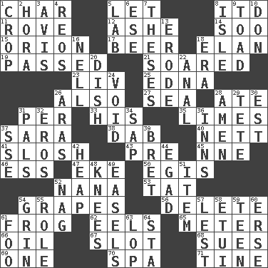 ACROSS 1. Burn to charcoal 5. Allow 8. It would 11. Be footloose 12. American tennis player Robert 14. "Barney Miller" actor Jack 15. Greek mythologigal hunter 17. Fermented drink made from hops 18. Flair 19. Went by 21. Flew 23. 54 in ancient Rome 25. Pulitzer Prize-winning author Ferber 26. In addition 27. Ocean 28. Had dinner 31. For each 33. Part of HMS, perhaps 35. Citrus fruits 37. "Two Mules for Sister ____" 38. Apply (a substance) by light strokes 40. Remaining after all deductions 41. Agitate, as a liquid 43. Before (prefix) 45. Compass dir. 46. Double-curved letter 47. Supplement with great effort 50. The front part of a cuirass 52. Grandmother 53. Make lace 54. Wine fruits 56. Erase 61. Toadlike animal 62. Snakelike fish 65. Distance measurement 66. Petroleum 67. Narrow, elongated depression 68. Institutes legal proceedings 69. Single 70. Health resort 71. Prong on a fork DOWN 1. Riding implement 2. Israeli folk dance 3. Opinion 4. Vintage cars 5. Experiment locale 6. Compass dir. 7. College papers 8. Capri or Wright 9. Frog relative 10. Spanish title 13. Eat (away) 16. 1994 drama film starring Jodie Foster 18. Period 20. Food container 22. Of or related to the anus 24. Null 26. Ancient river in northeast Turkey 28. So be it 29. Wig 30. Eastern Standard Time (abbr.) 31. Friends 32. Greek god of love 34. Plant excrement 36. Lodging establishments 37. Compass dir. 39. Cy Young winner Saberhagen 42. Pile 44. Mild oath 48. Leg joints 49. Artist's stands 51. A whole individual unit 52. Tired old horse 54. Amused look 55. Hero or heavy, e.g. 57. For fear that 58. Needle holder 59. Adolescent 60. Celtic language 61. Egg _ yung 63. Chop off 64. R.R. building