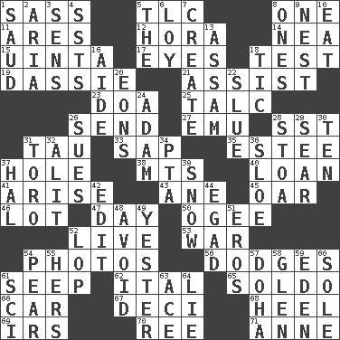 ACROSS 1. Backtalk 5. Affectionate concern, for short 8. Single 11. Ancient Greek god of war 12. Israeli folk dance 14. Teachers' org. 15. National forest in Provo, Utah 17. Sight organs 18. Trial 19. Small ungulate mammals of Africa 21. Aid 23. ___ good deed 25. Baby powder 26. Transmit 27. Australian flightless bird 28. Fast jet (abbr.) 31. The 19th letter of the Greek alphabet 33. Plant excrement 35. First name in cosmetics 37. Opening into or through something 38. Mountains (abbr.) 40. Grant temporary use of 41. Ascend 43. One (Scot) 45. Rowing implement 46. Car dealer's back yard 47. 24 hours 50. Double curve, resembling the letter S 52. Not recorded 53. Armed conflict 54. Pictures 56. Evades 61. Ooze 62. Slanted text style (abbr.) 65. Twentieth part of a lira 66. 4-wheeled motor vehicle 67. Tenth: prefix 68. The bottom of a shoe or boot 69. Big collection agency 70. Portuguese money of account (variant) 71. Queen of England 1702-14 DOWN 1. Saudi Arabian king (1953-1964) 2. Operatic vocal solo 3. Elected reps. 4. Fast planes 5. Definite Article 6. Myrna of the movies 7. Make 8. Washington bills 9. A home for chicks 10. Erode 13. Indian state 16. Helper 18. Nervous spasm 20. Immeasurably long periods of time 22. Turn sharply 24. First of billions? 26. Takes to court 28. Portico 29. Shrivel 30. "___ Little Indians" 31. "Corrida" creature 32. Set down 34. Parent Teacher Assoc. 36. _ gin 37. Actor Linden 39. Overwhelm 42. Prepare for publication 44. Mild oath 48. Keep away from 49. Last past 51. Greek god of love 52. Trim (branches) 54. Lightbulb-shaped fruit 55. Possessive pronoun 57. Capital of the state of Qatar 58. Small, secluded valley 59. Paradise 60. Flatfish 61. _-fi 63. Adept person 64. Whopper