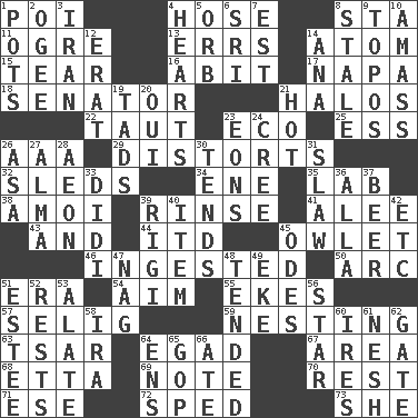 ACROSS 1. Luau course 4. Stockings 8. R.R. building 11. Legendary monster 13. Blunders 14. Tiny particle 15. Separate forcefully 16. "This won't hurt ____!" 17. California wine valley 18. Elected representative 21. Auras 22. Strained 23. Environmental prefix 25. Double-curved letter 26. Auto club (abbr.) 29. What propaganda does 32. Bobsleighs 34. Compass dir. 35. Experiment locale 38. Mine, in Marseilles 39. Remove soap 41. Toward shelter 43. Added to 44. It would 45. A small or young owl 46. Eaten 50. Curve 51. Period 54. Direct toward a target or goal 55. Supplements with great effort 57. Major League Baseball Commissioner Bud 59. Nestling 63. Russian ruler of old 64. Mild oath 67. Length times width 68. Singer James 69. Observe 70. Repose 71. Compass dir. 72. Hurried 73. A female animal or person DOWN 1. Plant holders 2. Double curve, resembling the letter S 3. SW Asia republic 4. Centers 5. Globe 6. _ Lanka 7. Eastern Standard Time (abbr.) 8. Lacking originality or spontaneity 9. Traditional theme or motif 10. Collect or gather 12. Part of Q.E.F. 14. Santa ___, CA 19. Bits 20. Fr. "Yes" 21. Being at a high temperature 23. Immeasurably long periods of time 24. Algonquian 26. White ___ sheet 27. _ mater 28. Period of immesurable duration 30. Is inclined (to) 31. Cole _ (cabbage dish) 33. "You Light Up My Life" star Conn 36. Silent film actress Nazimova 37. Fermented drink made from hops 39. Swiss mountan, "Queen of the Mountains" 40. Detail 42. And so on (abbr.) 45. Lyric poems 47. Tired old horse 48. Looked after 49. Make supply last 51. First name in cosmetics 52. Musical pauses 53. Having winglike extensions 56. Play the lead 58. Retirement account (abbr.) 60. Angers 61. Tender 62. Yard entry 64. Followers of ems 65. Republican Party 66. Had dinner