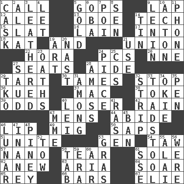 ACROSS 1. Give a ring to 5. Republicans 9. Infant locale 12. Toward shelter 13. Mitch Miller's instrument 14. Technical work 15. Narrow board 16. (Had) reclined 17. To the inside or interior of 18. Krazy ___ of comics 19. Added to 21. The state of being joined or united 22. Israeli folk dance 24. Personal Computers (abbr.) 26. Compass dir. 27. Theater features 28. Helper 29. Small pie 30. Makes less strong or intense 32. Close up, plug up 36. Malaysian steamed pastry 37. Big _ 38. Casino tip 39. Probability 40. Failure 42. Precipitation 43. Not women's 44. Stay 46. Mouth edge 49. Russian fighter aircraft 50. Plant excrements 51. Join together 53. Commissioned military rank (abbr.) 54. The 23rd letter of the Hebrew alphabet 57. Billionth: prefix 58. Rend 61. Not divided or shared with others 62. Afresh 63. Operatic vocal solo 64. Fly high 65. Marina Del _, California 66. Long, evenly shaped pieces 67. Writer Wiesel DOWN 1. Keg 2. Silent film actress Nazimova 3. Tough but pliablecoriaceous 4. Allow 5. Gilt 6. Chief or king in Benin or Nigeria 7. Luau course 8. Elected rep. 9. Soviet premier 1918-24 10. 13-14th century defensive garment 11. Give a jingle 14. Metal container 19. Tate display 20. Political cartoonist Thomas 21. Purpose 23. Curses 24. Part 25. Music discs 27. Saudi Arabian king (1953-1964) 28. Collect or gather 29. Ring climax 31. Amid 32. Empty completely 33. Inedible or poisonous agaric 34. Migrant worker of the '30s 35. Animal enclosure 40. Luau accessory 41. Raze (variant) 43. Madame (abbr.) 45. Prohibit 46. Type of eclipse 47. Lacking in sense or substance 48. Abounding in pines 52. Pull behind 53. Pate de foie ____ 55. Jai _ 56. We are 58. Bar bill 59. Period 60. Atmosphere 61. Compass dir.