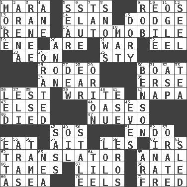 ACROSS 1. Hindu Mythology: god of death 5. Fast planes 9. Vintage cars 13. NW Algerian seaport 14. Enthusiasm 15. Evade 16. French philosopher Descartes 17. Form of transportation 19. Compass dir. 20. "We ___ not amused" (Victoria) 21. Armed conflict 22. Snakelike fish 23. Age 25. Filthy place 26. Cowboy competition 30. Water vessel 34. Approach 35. Celtic language 36. For fear that 39. Compose 42. California wine valley 43. Otherwise 44. Fertile tracts in a desert 46. Passed on 47. New (sp.) 48. Distress signal 51. Inside; within (prefix) 54. Ingest 57. Small island 58. French article 60. Big collection agency 62. Interpreter 65. Of or related to the anus 66. Softens 67. _ and Stitch 68. Assign a rank or rating to 69. At sea 70. Snakelike fish 71. Flintstone DOWN 1. Greater amount 2. Sports stadium 3. The wife of a rajah (variant) 4. A saturated hydrocarbon 5. Burn superficially 6. Change direction abruptly 7. Make lace 8. Overwhelms 9. Director Reiner 10. Singer Brickell 11. Stare at amorously 12. Sew up the eyelids of hawks and falcons 15. Small, narrow, flatbottom fishing boat 18. Floor protector 20. Soon (poet.) 24. Declaimed 27. Morning condensation 28. Hearing organ 29. Greek mythologigal hunter 30. Gillaume's butler role 31. Mouth or opening 32. Viper 33. Beverage made from leaves 36. Directed 37. Biblical high priest 38. Compass dir. 40. The 19th letter of the Greek alphabet 41. Compass dir. 45. Nights before holidays 48. Backtalk 49. Petroleum 50. Lacking originality or spontaneity 52. Middle Eastern gold or silver currency 53. Speak pompously 54. Singer James 55. Ancient river in northeast Turkey 56. Docile 58. Hang loosely or laxly 59. Greek god of love 61. Downhill vehicle 63. Teachers' org. 64. Make a knot 65. Sandy's bark