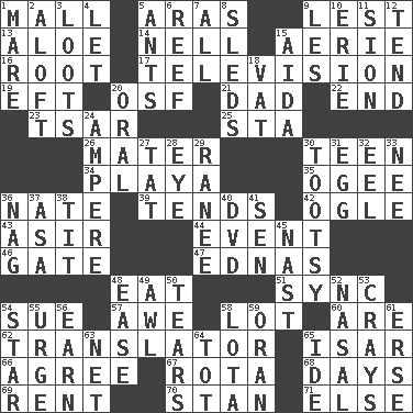 ACROSS 1. Shopping center 5. Ancient river in northeast Turkey 9. For fear that 13. _ vera 14. 1994 drama film starring Jodie Foster 15. Nest on high 16. Carrot, for example 17. Household entertainment appliance 19. Bank Draft (abbr.) 20. Order of Saint Francis (abbr.) 21. Male parent 22. Conclusion 23. Russian ruler of old 25. R.R. building 26. Mother 30. Adolescent 34. Beach, in Buenos Aires 35. Double curve, resembling the letter S 36. Nathan's nickname 39. Is inclined (to) 42. Stare at amorously 43. SW Saudi Arabia district 44. Happening 46. Yard entry 47. Ferber et al. 48. Ingest 51. Synchronize (abbr.) 54. Institute legal proceedings 57. Deep reverence 58. Car dealer's back yard 60. "We ___ not amused" (Victoria) 62. Interpreter 65. Austrian river, tributary to the Danube 66. Match 67. Round or rotation of duties 68. 24-hour periods 69. Monthly bill 70. Comedian Laurel of Laurel & Hardy 71. Otherwise DOWN 1. Female horse 2. High up in or into the air 3. Plunders 4. Allow 5. Pismires 6. Coral collection 7. 100% 8. Bobsleighs 9. French article 10. One of the Great Lakes 11. The Jewish people; Israel 12. Watch over 15. Opera by Verdi 18. Large container 20. Of the mouth 24. Electrical Unit 27. Make lace 28. Sight organ 29. The wife of a rajah (variant) 30. Tootsie (variant) 31. Ovum 32. Snakelike fish 33. Born 36. Tired old horse 37. White ___ sheet 38. Teat (slang) 40. Movie disc 41. Elected rep. 45. Political cartoonist Thomas 48. Relaxation 49. Leather borer 50. Rends 52. Relating to the nose 53. Trading vessels 54. Play the lead 55. Goad 56. Merit 58. Globular water bottle used in Asia 59. NW Algerian seaport 61. Celtic language 63. Fish or hair follower 64. Small child 65. Binary compound