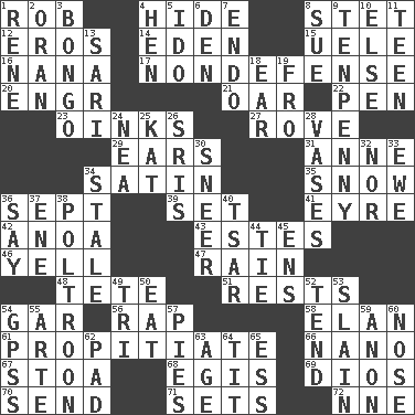 ACROSS 1. Director Reiner 4. Flintstone garb 8. Proofreading order 12. Greek god of love 14. Locale of original sin 15. Ubangi River tributary 16. Grandmother 17. Unrelated to defense, as in spending 20. Engineer (abbr.) 21. Rowing implement 22. Fenced enclosure 23. Pig sounds 27. Be footloose 29. Hearing organs 31. Queen of England 1702-14 34. Smooth fabric 35. Frozen precipitation 36. Back-to-school mo. 39. Put into a specified state 41. Jane of fiction 42. Small Philippine buffalo 43. _____ Park, CO 46. Shout 47. Precipitation 48. False hair 51. Musical pauses 54. Slender fish 56. Hit sharply and swiftly 58. Liveliness 61. Conciliate 66. Billionth: prefix 67. Portico 68. The front part of a cuirass 69. "Vaya con ____" 70. Post 71. Arranges properly for use 72. Compass dir. DOWN 1. French philosopher Descartes 2. NW Algerian seaport 3. Beat drum 4. Layer 5. Wedding promise 6. Lair 7. Inside; within (prefix) 8. Take to court 9. 3-inch nail 10. Otherwise 11. Adolescent 13. Indian skirt 18. Hearing organ 19. Away 24. Teachers' org. 25. Krazy ___ of comics 26. Indian titles of respect 28. Flower holders 30. Contemptuous expression 32. Not either 33. She-sheep 34. Lacking originality or spontaneity 36. Declare 37. Compass dir. 38. Characterized by complete cowardliness 40. Russian ruler of old 44. Neckwear 45. Followers of ems 49. Three (prefix) 50. Ingest 52. Be inclined (to) 53. Killed 54. Global Positioning Systems (abbr.) 55. Johnson of "Laugh-In" 57. Sliced desserts 59. Soon (poet.) 60. Sense of smell 62. Writing tablet 63. Grow older 64. Teat (slang) 65. Curvy letter